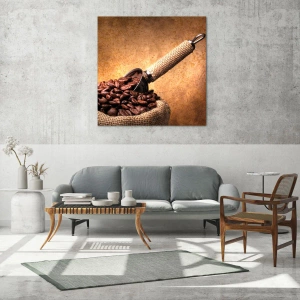 Glasbild - Bild auf glas - Kaffeebohnen in einem Jutebeutel mit einem Metalllöffel - 140x50cm - An der Quelle des Geschmacks - Moderne Wanddekoration für Wohnzimmer und Schlafzimmer ARTTOR