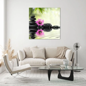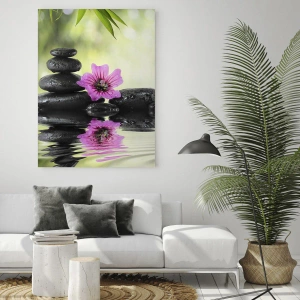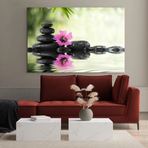 Glasbild - Bild auf glas - Zen-Steine und eine rosa Blume spiegeln sich im Wasser - 120x50cm - Zeit für die Seele - Moderne Wanddekoration für Wohnzimmer und Schlafzimmer ARTTOR