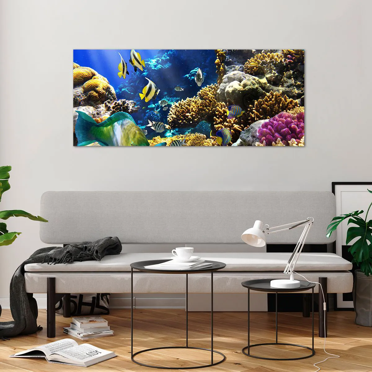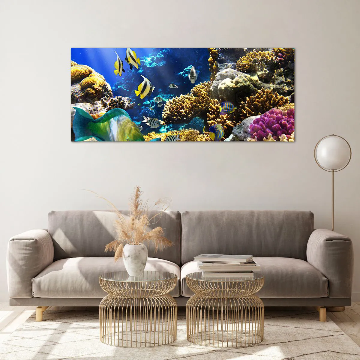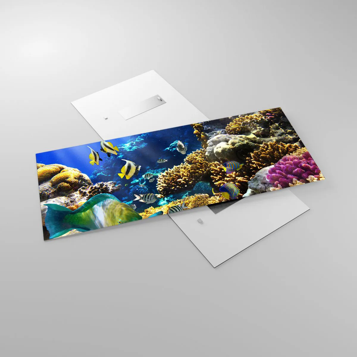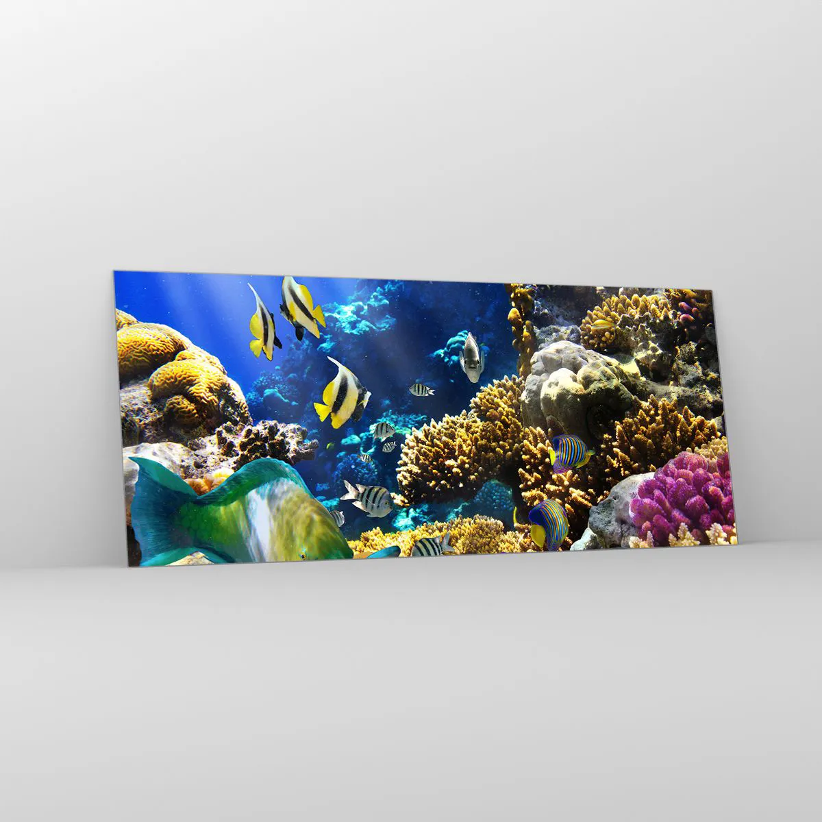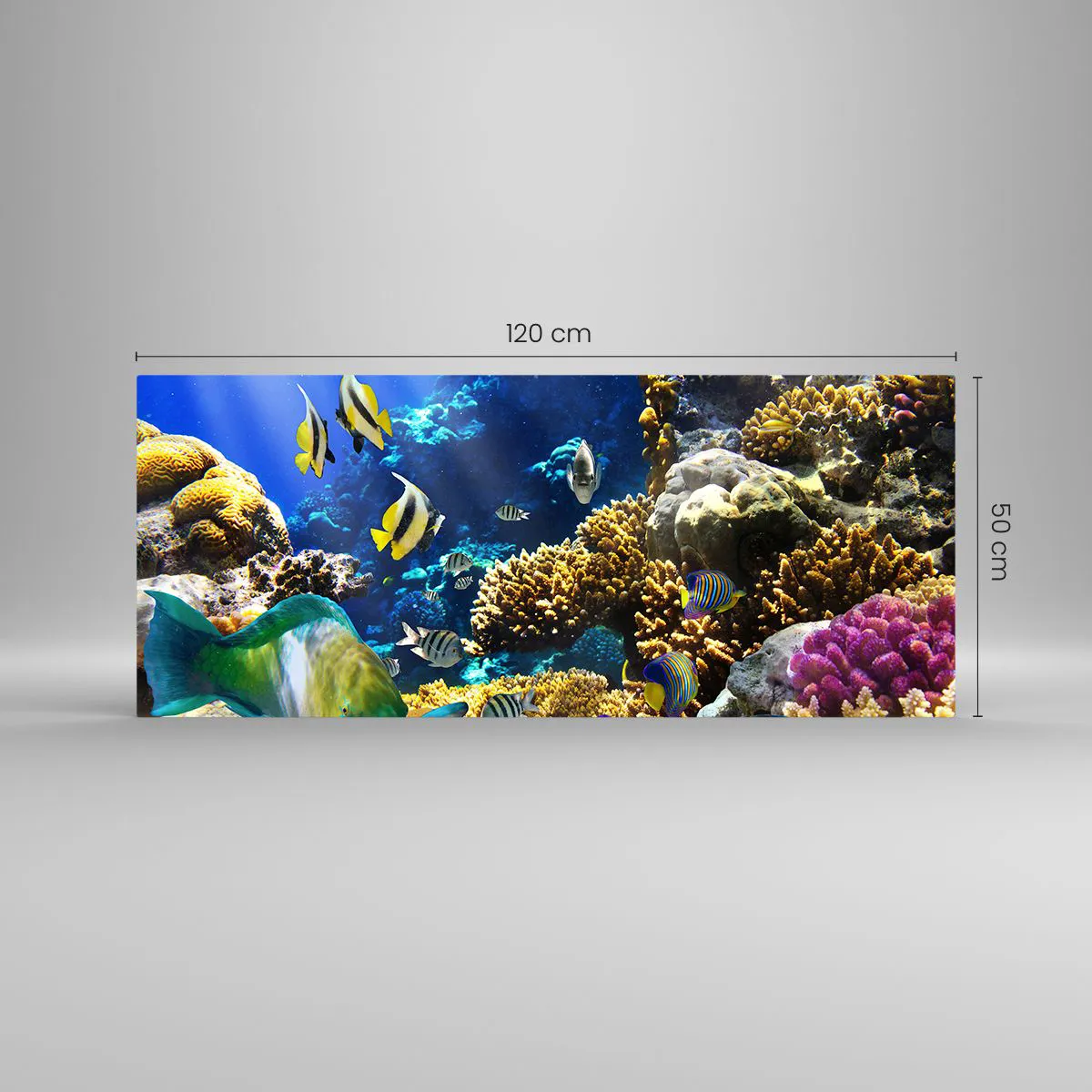 Glasbild - Bild auf glas - Ein farbenfrohes Korallenriff mit tropischen Fischen in den Tiefen des Ozeans. - 120x50cm - Viel Verkehr auf dem Ferienweg - Moderne Wanddekoration für Wohnzimmer und Schlafzimmer ARTTOR