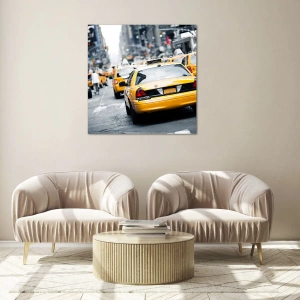 Glasbild - Bild auf glas - Gelbe Taxis auf den Straßen von New York im Großstadttrubel - 120x80cm - Nur in dieser Stadt - Moderne Wanddekoration für Wohnzimmer und Schlafzimmer ARTTOR