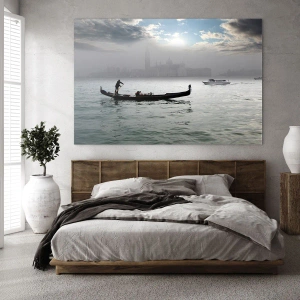 Glasbild - Bild auf glas - An einem nebligen Morgen gleitet eine Gondel über die Gewässer Venedigs und bietet einen Blick auf die Stadt. - 70x100cm - Eine fabelhafte Stadt aus Wasser und Nebel - Moderne Wanddekoration für Wohnzimmer und Schlafzimmer ARTTO