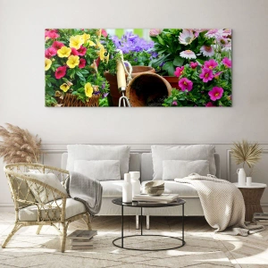 Glasbild - Bild auf glas - Bunte Blumen in Töpfen mit Gartengeräten auf dem Tisch - 120x50cm - Zosias Garten - Moderne Wanddekoration für Wohnzimmer und Schlafzimmer ARTTOR