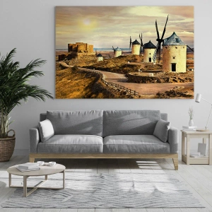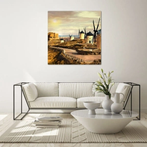 Glasbild - Bild auf glas - Windmühlen und eine Burg in der Landschaft bei Sonnenuntergang - 120x80cm - Don Quijote kommt gleich - Moderne Wanddekoration für Wohnzimmer und Schlafzimmer ARTTOR