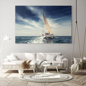 Glasbild - Bild auf glas - Eine Yacht segelt auf stürmischer See unter blauem Himmel - 120x80cm - Sie werden uns nicht einholen! - Moderne Wanddekoration für Wohnzimmer und Schlafzimmer ARTTOR