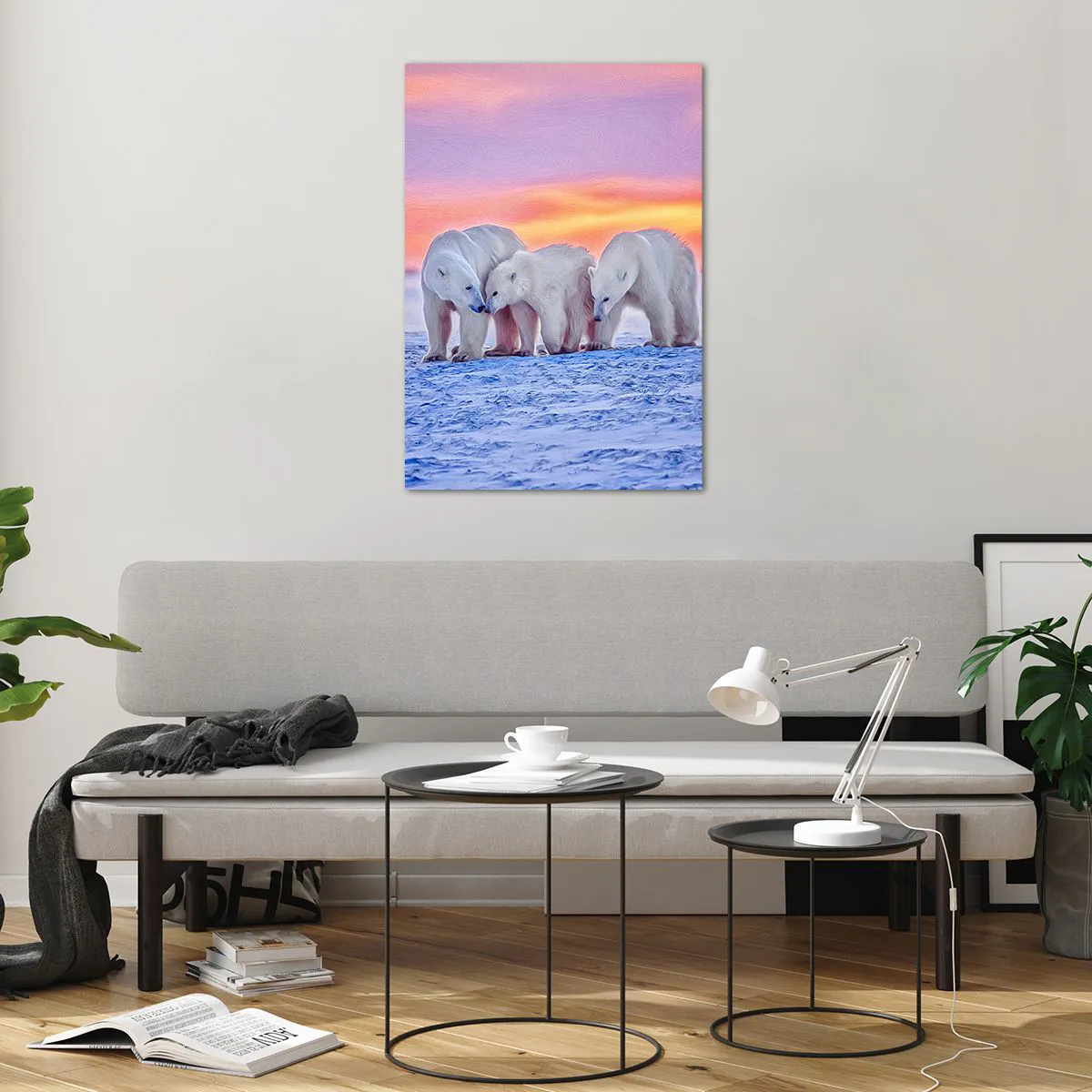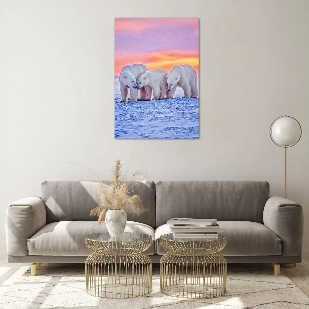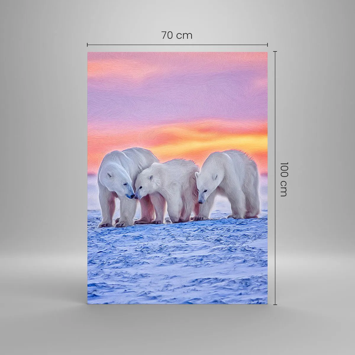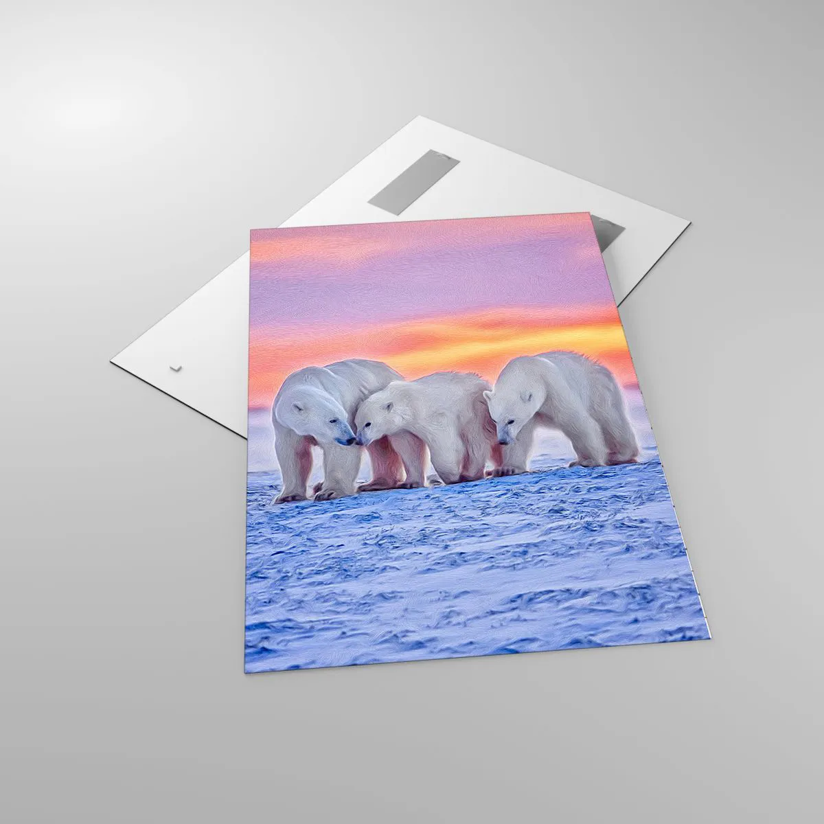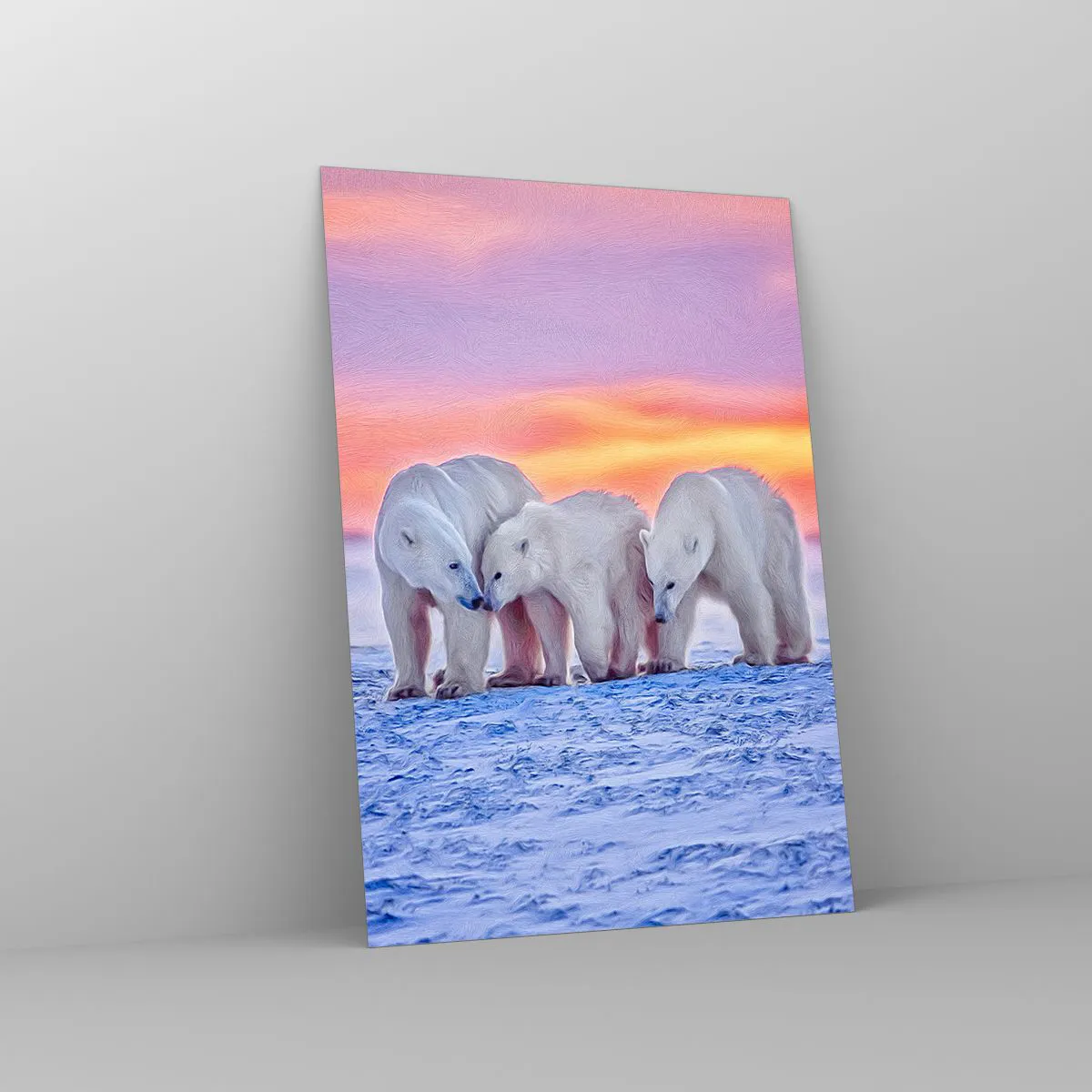 Glasbild - Bild auf glas - Drei Eisbären vor dem Hintergrund eines arktischen Sonnenuntergangs - 70x100cm - Familienwärme ist genug - Moderne Wanddekoration für Wohnzimmer und Schlafzimmer ARTTOR