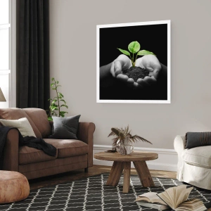 Poster - Hände halten eine grüne Pflanze auf schwarzem Hintergrund - 100x70cm - Ich liebe die Natur, ich beschütze sie - Moderne Wanddekoration für Wohnzimmer und Schlafzimmer ARTTOR