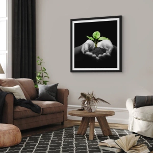 Poster in einem schwarzem Rahmen - Hände halten eine grüne Pflanze auf schwarzem Hintergrund - 70x50cm - Ich liebe die Natur, ich beschütze sie - Moderne Wanddekoration für Wohnzimmer und Schlafzimmer ARTTOR