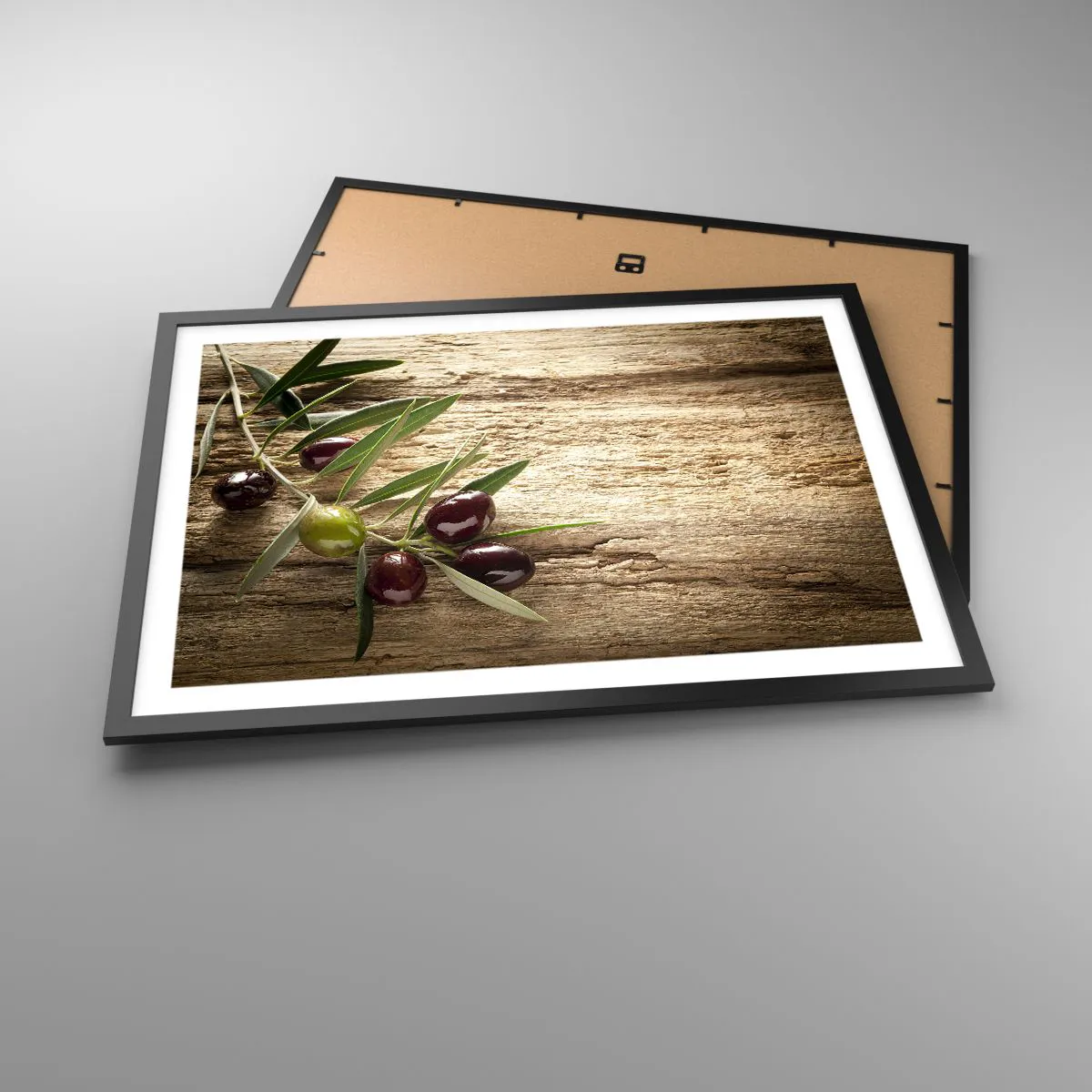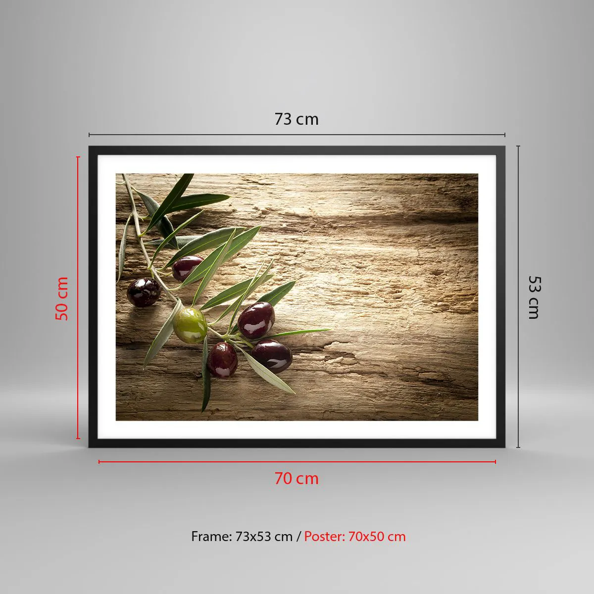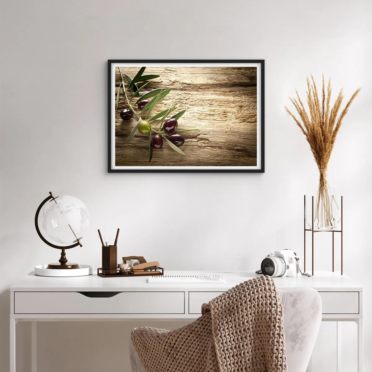 Poster in einem schwarzem Rahmen - Olivenzweig mit Früchten auf einem Hintergrund aus gealtertem Holz - 70x50cm - Direkt aus der Natur - Moderne Wanddekoration für Wohnzimmer und Schlafzimmer ARTTOR