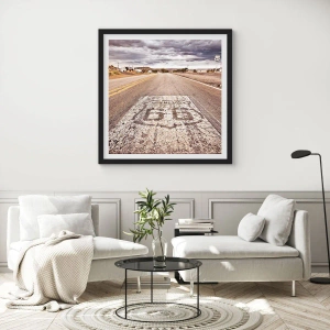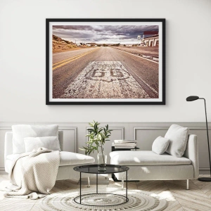 Poster in einem schwarzem Rahmen - Route 66 in einem Wüstenklima mit malerischem Himmel - 100x70cm - Mother Road - eine amerikanische Legende - Moderne Wanddekoration für Wohnzimmer und Schlafzimmer ARTTOR