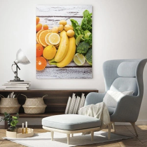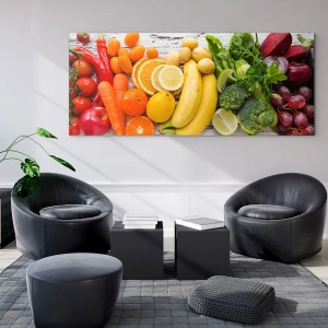 - Dieser Glasdruck zeigt buntes Obst und Gemüse, arrangiert auf einem Holztisch. Eine perfekte Dekoration für Küchen und Esszimmer, die Frische und Harmonie in die Natur bringt.