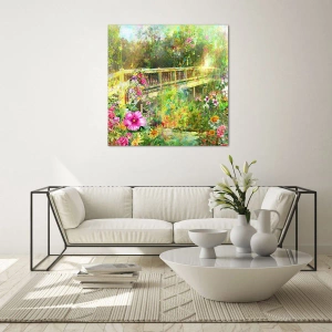 Eine kleine Brücke, umgeben von üppiger Vegetation und bunten Blumen, ist ein Kunstwerk, das inspiriert und das Auge anzieht. Das Gemälde ist auch ein einzigartiges Geschenk für Naturliebhaber und Liebhaber origineller Dekorationen.