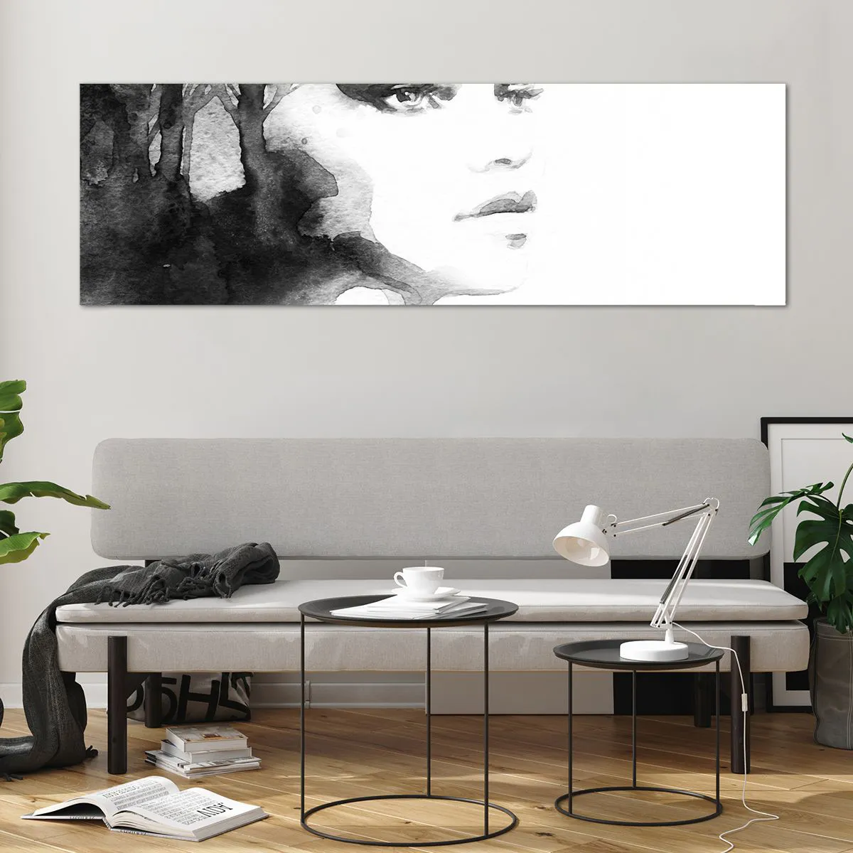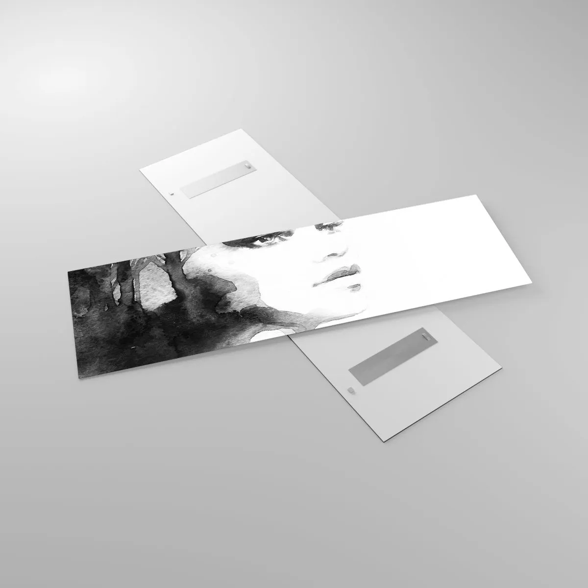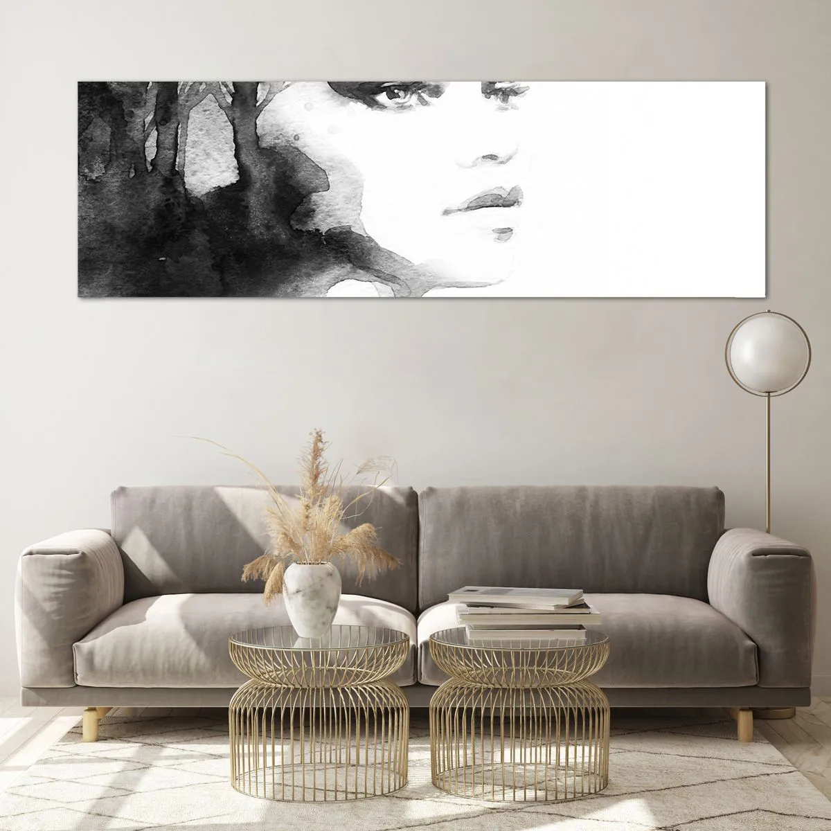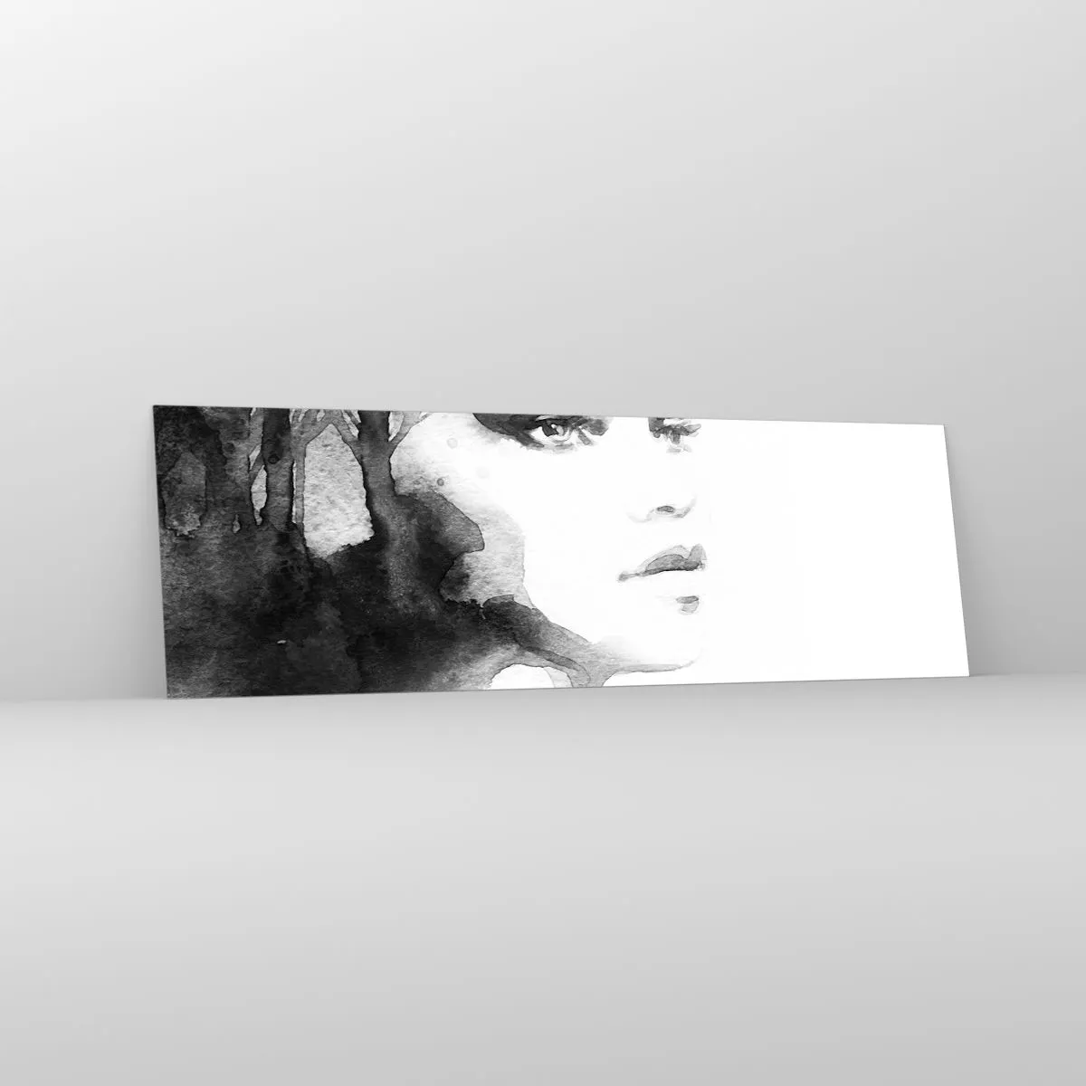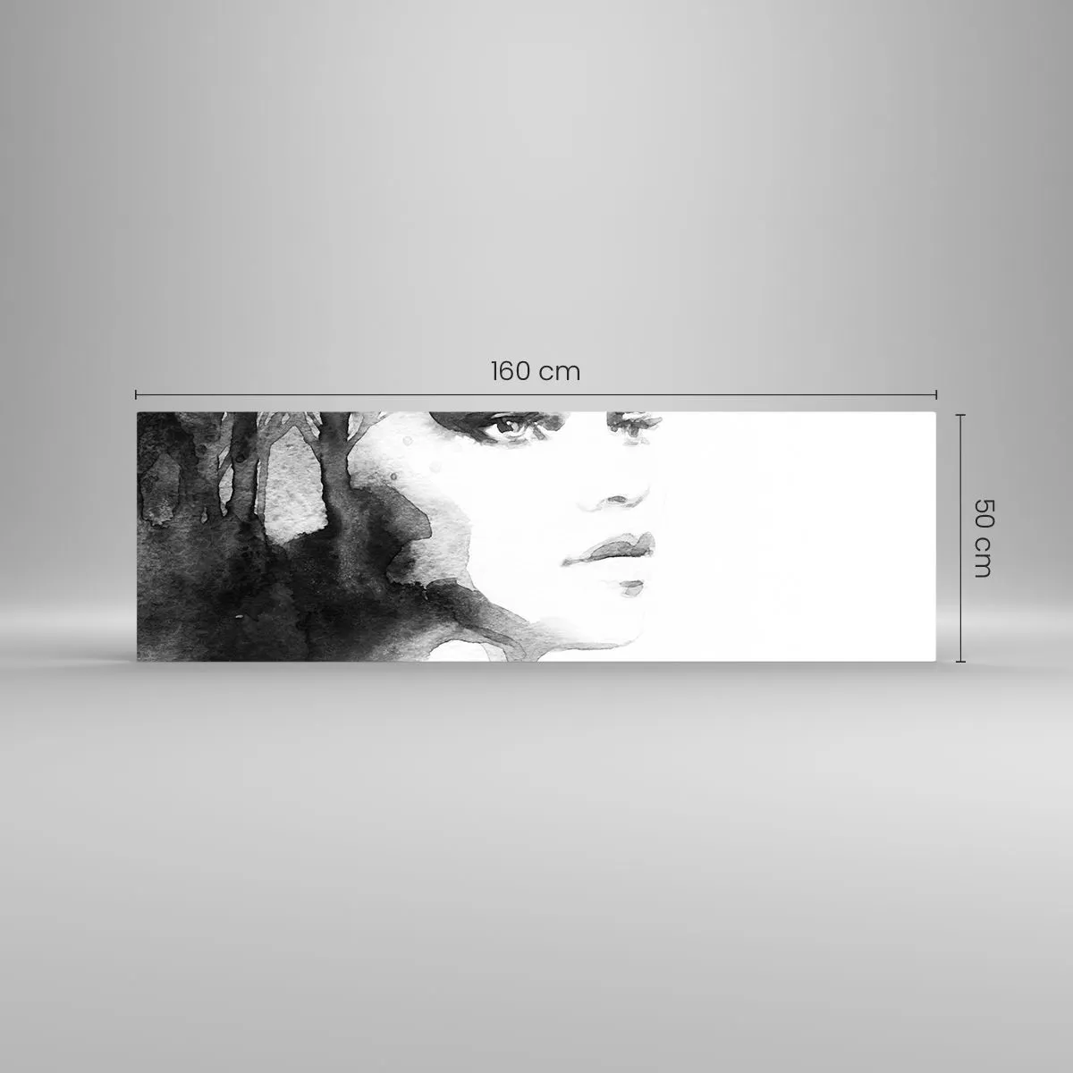 Glasbild - Bild auf glas - Ein subtiles Porträt einer Frau in Schwarz-Weiß-Tönen - 160x50cm - Aus Geheimnis und Nebel - Moderne Wanddekoration für Wohnzimmer und Schlafzimmer ARTTOR