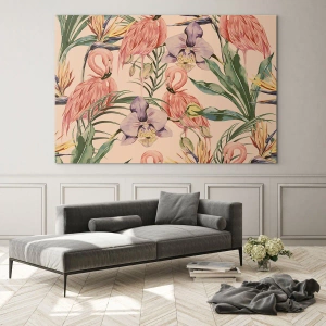 Glasbild - Bild auf glas - Flamingos umgeben von tropischen Blumen und Pflanzen - 50x70cm - Rosa Ballett in Blumen - Moderne Wanddekoration für Wohnzimmer und Schlafzimmer ARTTOR