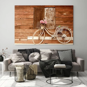 - Dieser Glasdruck zeigt ein Fahrrad mit Blumen vor einer Holzwand. Sein rustikaler Retro-Stil mit romantischem Touch passt perfekt in gemütliche Innenräume.