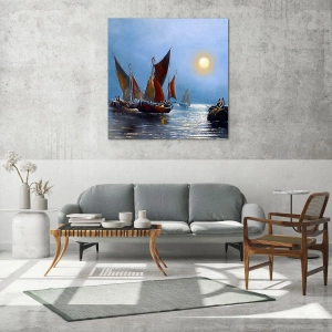 Glasbild - Bild auf glas - Boote mit Segeln auf ruhigem Wasser bei Sonnenuntergang - 70x100cm - Nachtfang - Moderne Wanddekoration für Wohnzimmer und Schlafzimmer ARTTOR