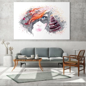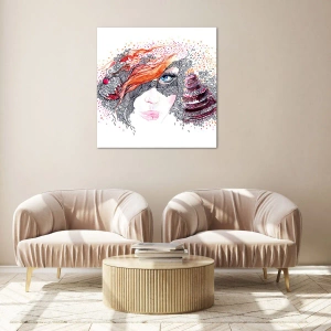 • Abstraktion, Frauengesicht, Kuchen, Menschen, Masken, Mode, Kunst, Für den Flur, für das Wohnzimmer, für das Schlafzimmer, , Weiß, Schwarz, Orange, Quadrat