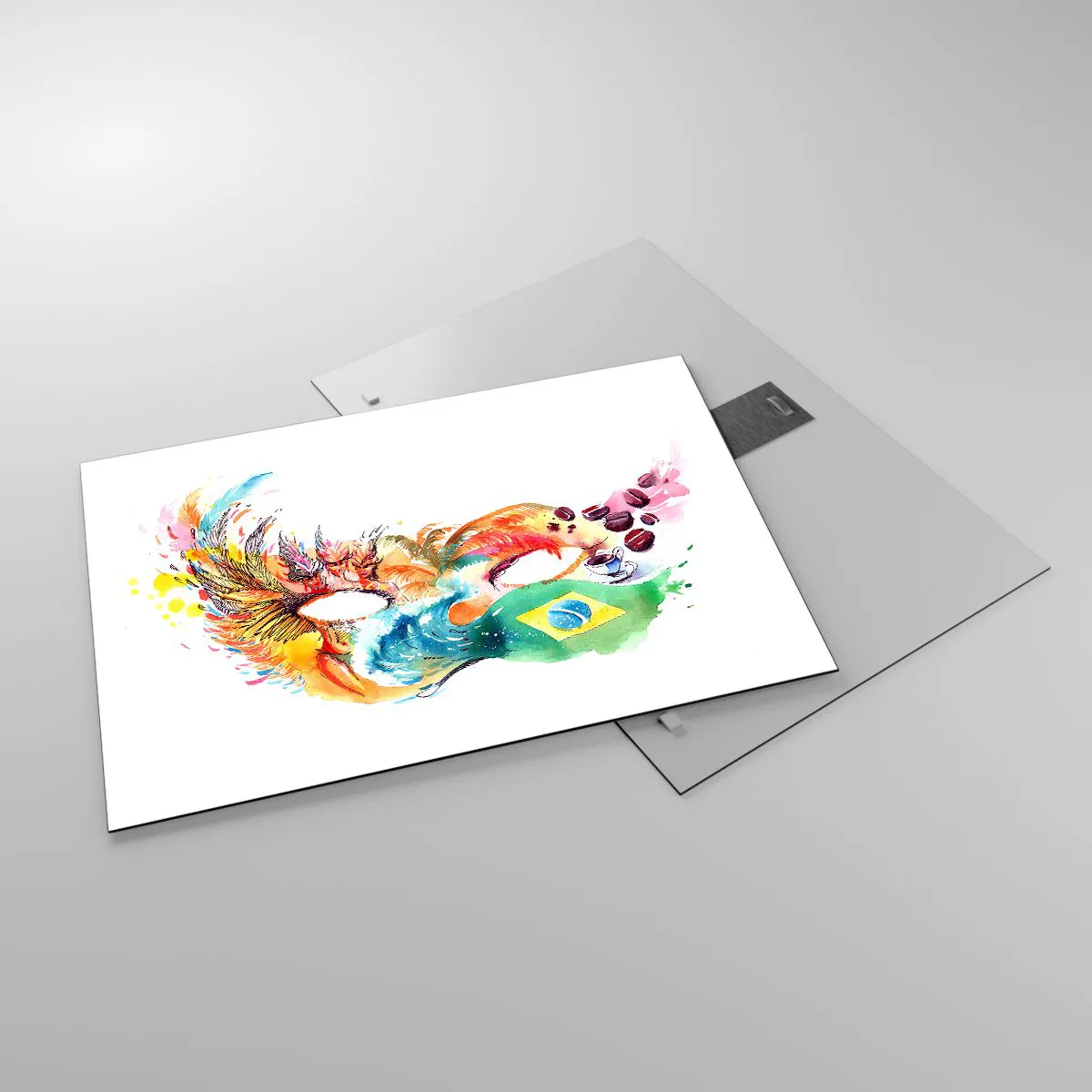 Das Gemälde ist auf hochwertigem Glas gefertigt, was ihm einen eleganten Glanz und Langlebigkeit verleiht. Präziser Glasdruck bewahrt Farbtiefe und einzigartige Details wie die Federstruktur und Farbdynamik.