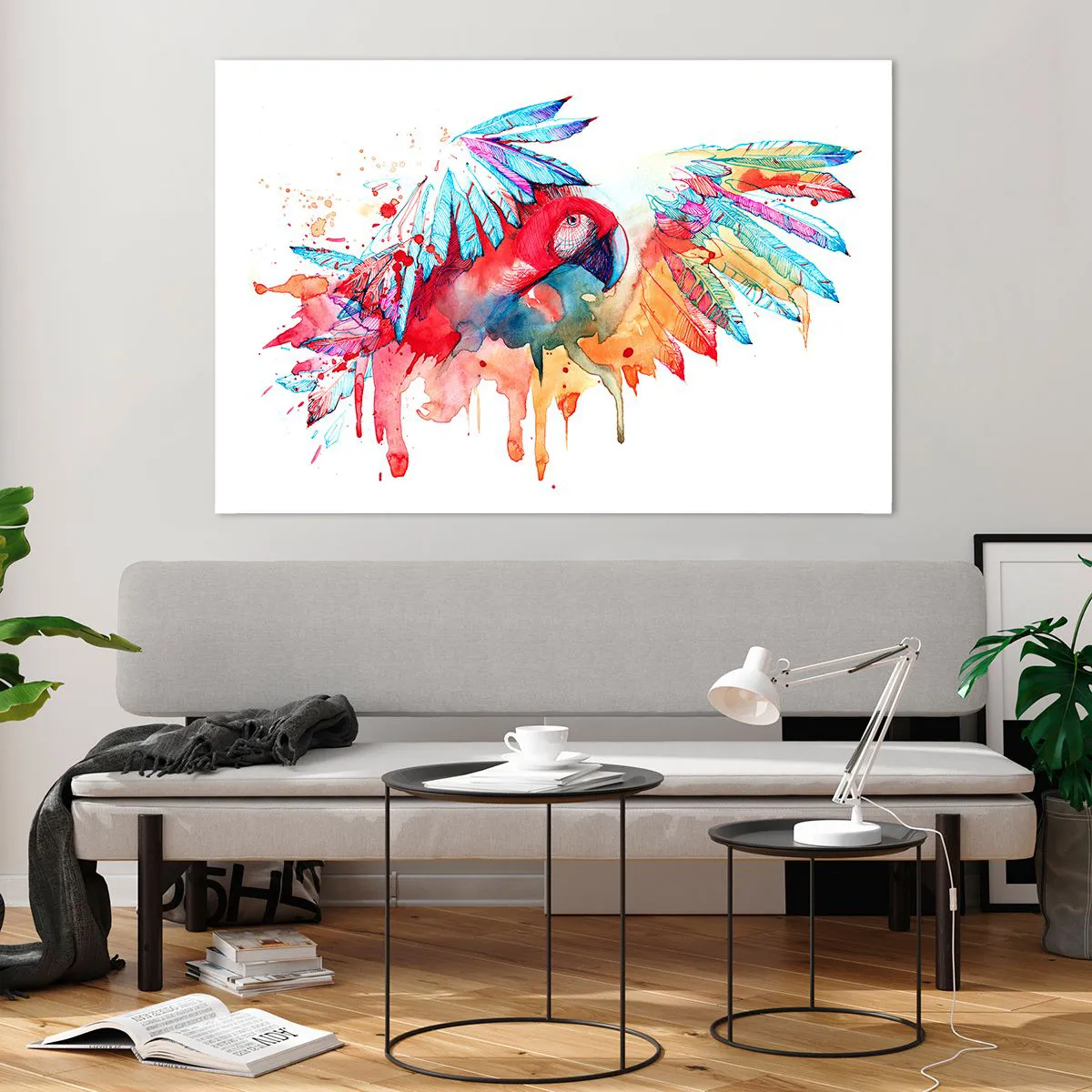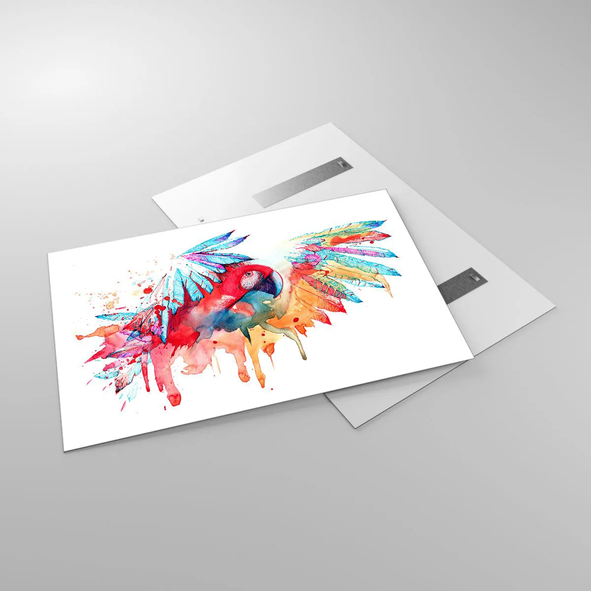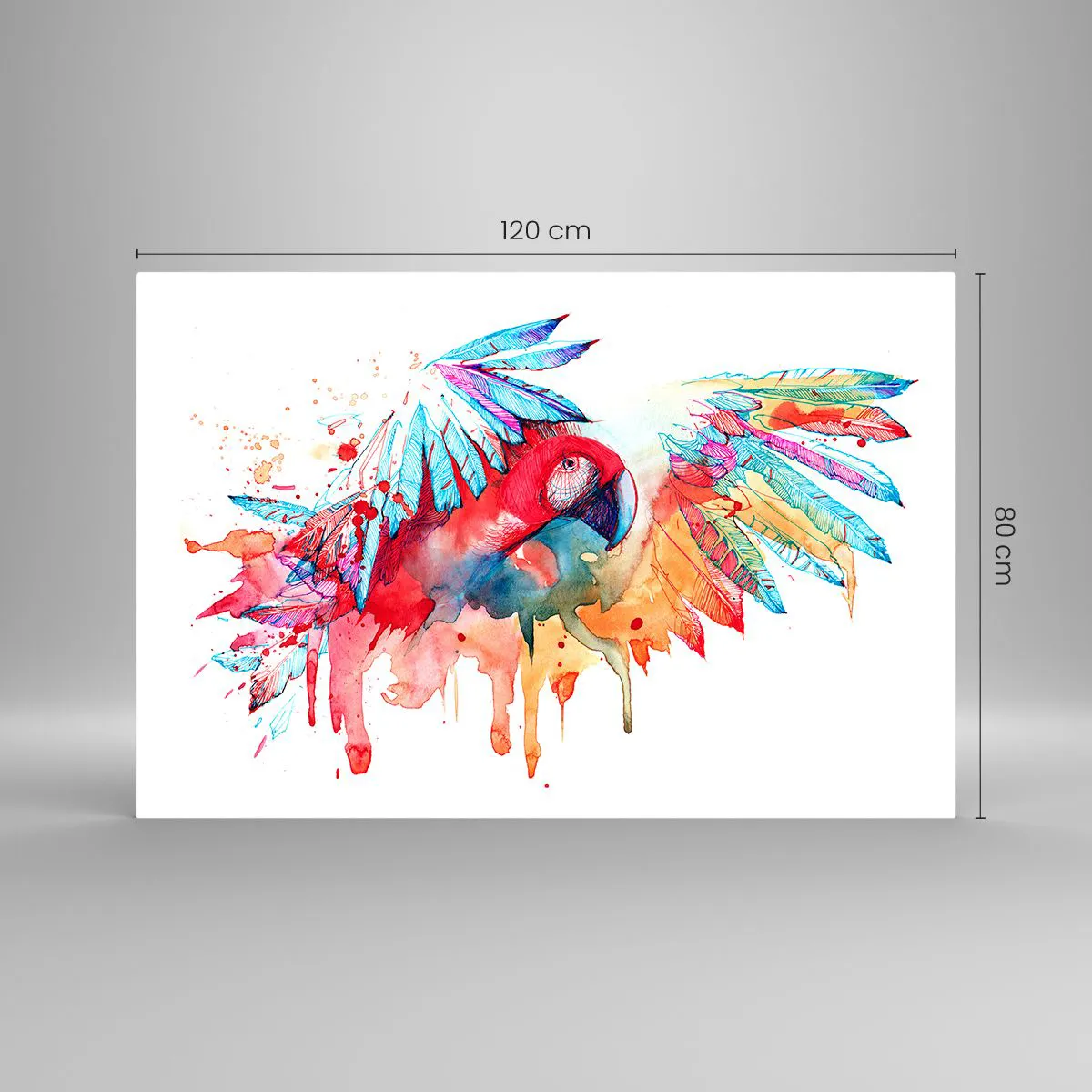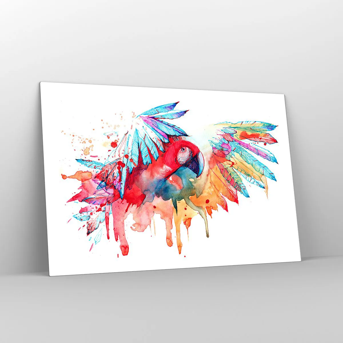 Glasbild - Bild auf glas - Bunter Aquarellpapagei mit ausgebreiteten Flügeln - 120x80cm - Bunte Papageien - Moderne Wanddekoration für Wohnzimmer und Schlafzimmer ARTTOR