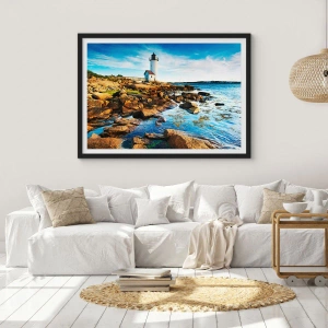 Poster in einem schwarzem Rahmen - Ein Leuchtturm an einer felsigen Küste an einem sonnigen Tag - 70x50cm - Komm glücklich zurück, ich warte - Moderne Wanddekoration für Wohnzimmer und Schlafzimmer ARTTOR