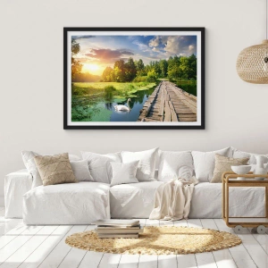 Poster in einem schwarzem Rahmen - Eine Holzbrücke über einen Fluss, umgeben von Grün - 50x70cm - Sommer, Sommer überall - Moderne Wanddekoration für Wohnzimmer und Schlafzimmer ARTTOR
