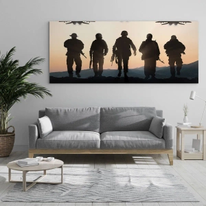 Glasbild - Bild auf glas - Soldaten vor der Kulisse der untergehenden Sonne und Jets - 50x70cm - Willkommen in unserer Welt - Moderne Wanddekoration für Wohnzimmer und Schlafzimmer ARTTOR