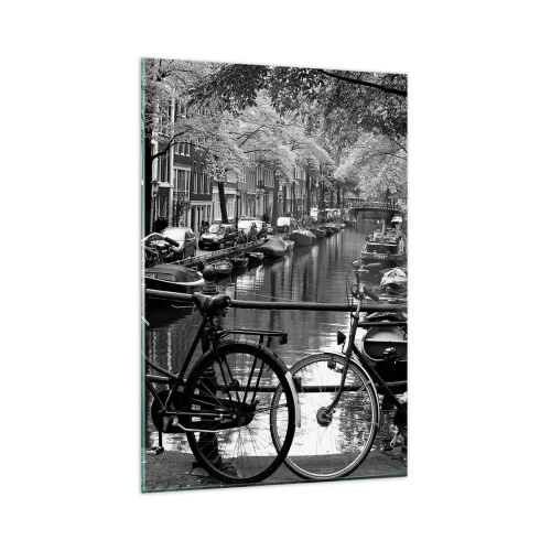 Glasbild - Bild auf glas - Kanal mit Fahrrädern in Schwarzweißfotografie - 80x120cm - Ein sehr holländischer Anblick - Moderne Wanddekoration für Wohnzimmer und Schlafzimmer ARTTOR