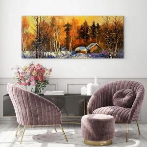 Glasbild - Bild auf glas - Winterlandschaft mit einem Holzhaus bei Sonnenuntergang - 120x80cm - Wintereindruck in der Sonne - Moderne Wanddekoration für Wohnzimmer und Schlafzimmer ARTTOR