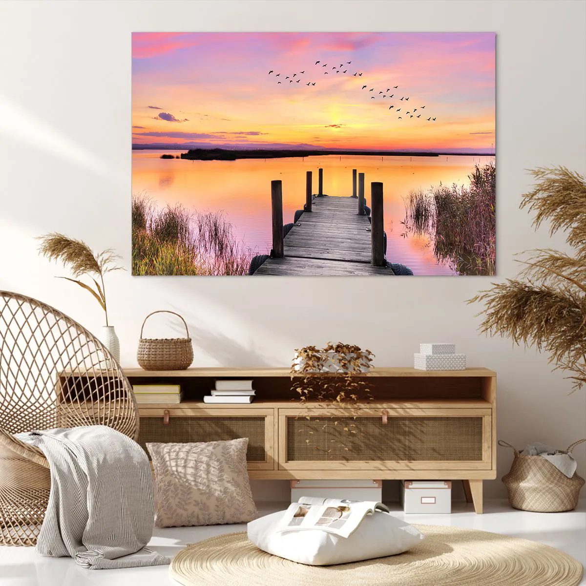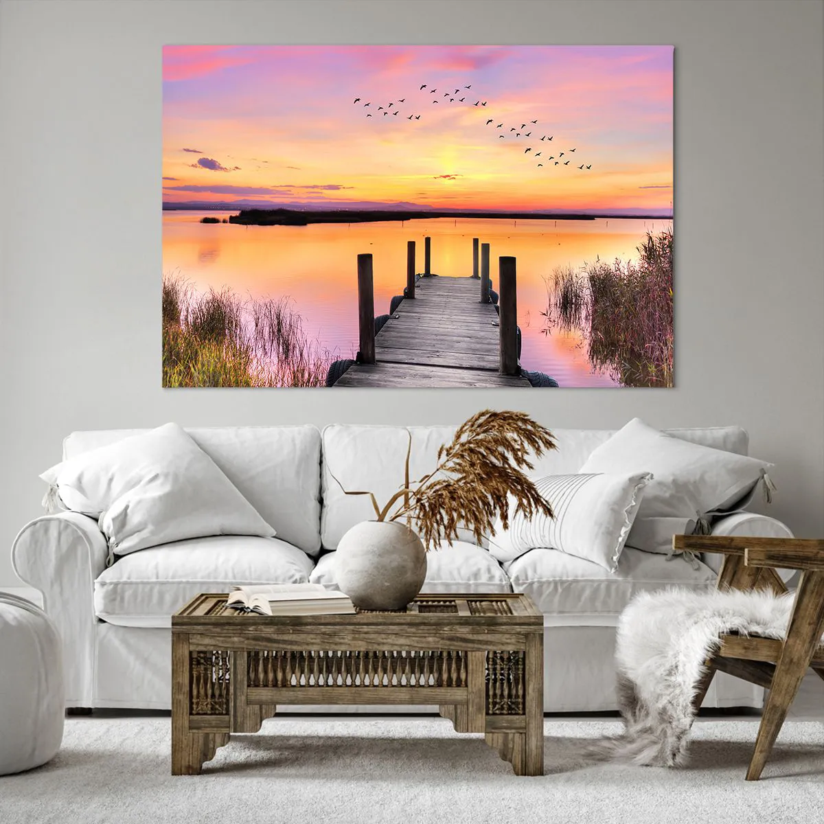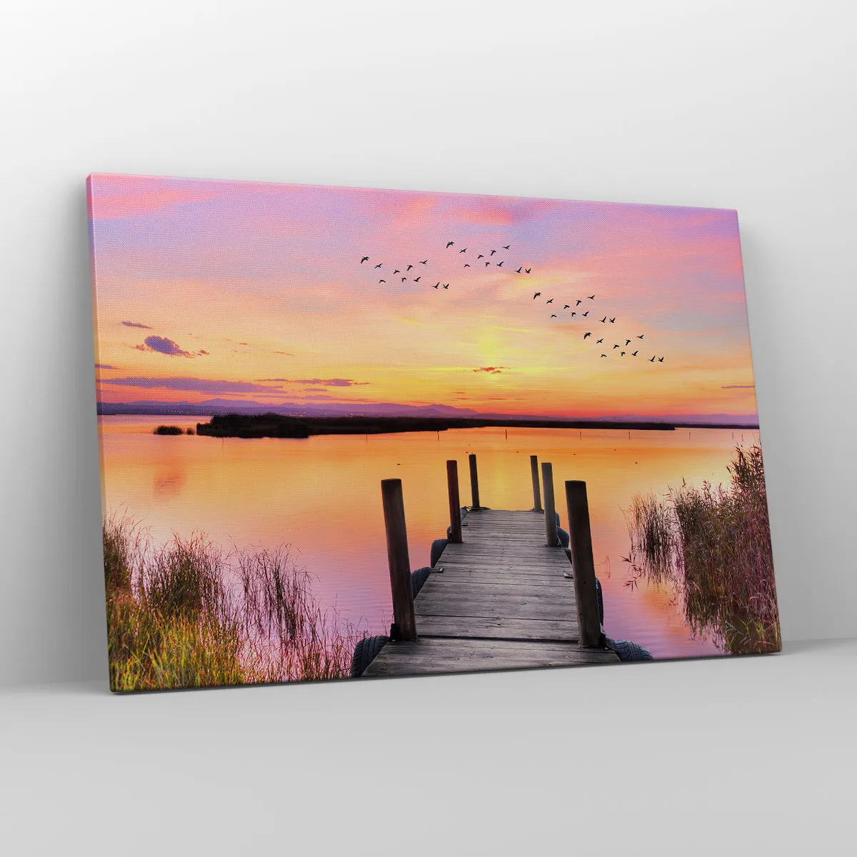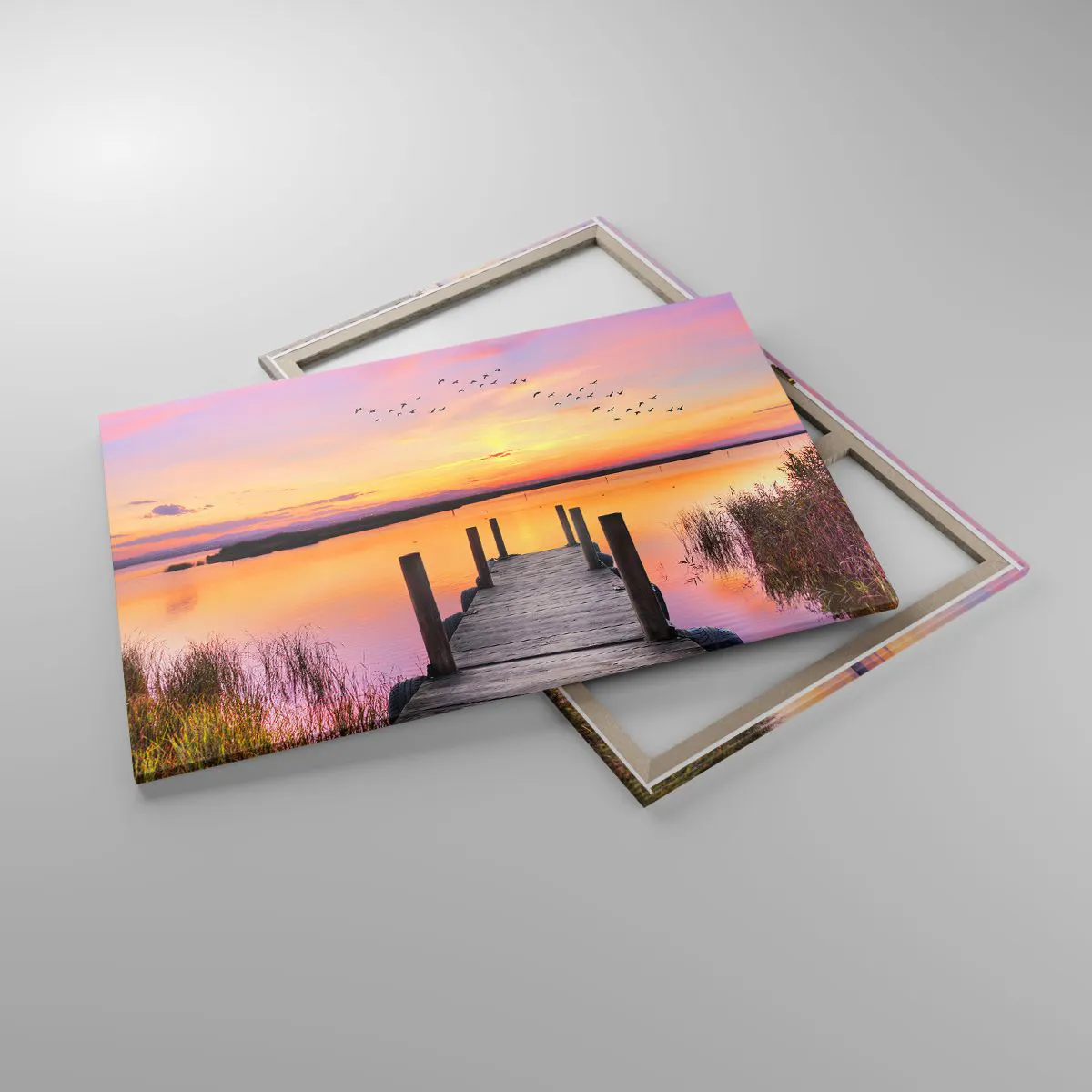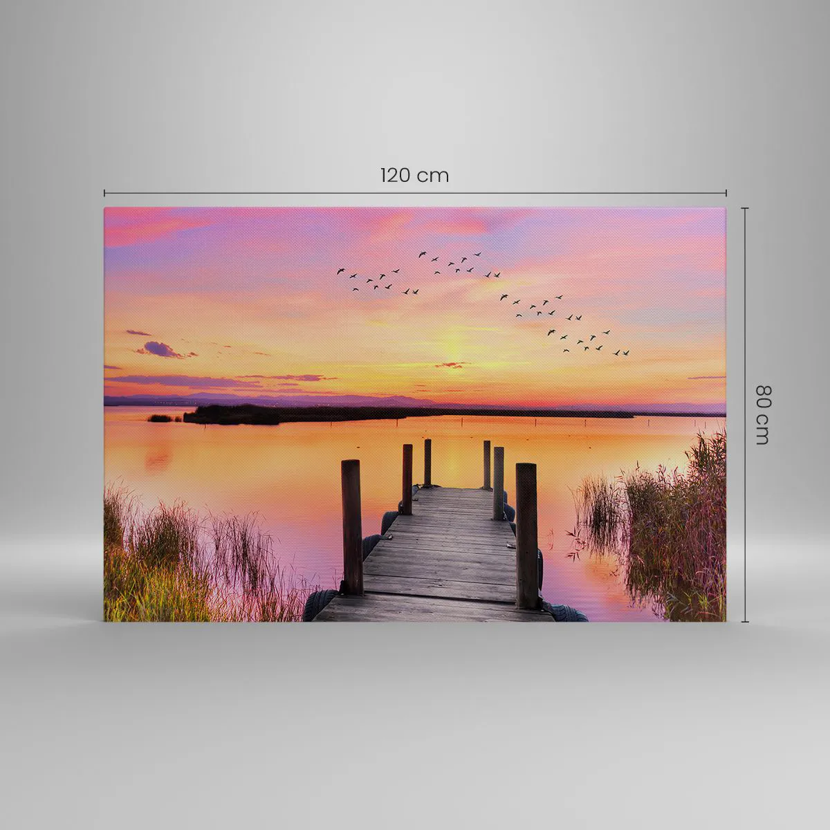 Bild auf Leinwand - Leinwandbild - Ein Pier an einem See bei Sonnenuntergang mit Vögeln am Himmel - 120x80cm - Violette stille Morgendämmerung - Moderne Wanddekoration für Wohnzimmer und Schlafzimmer ARTTOR