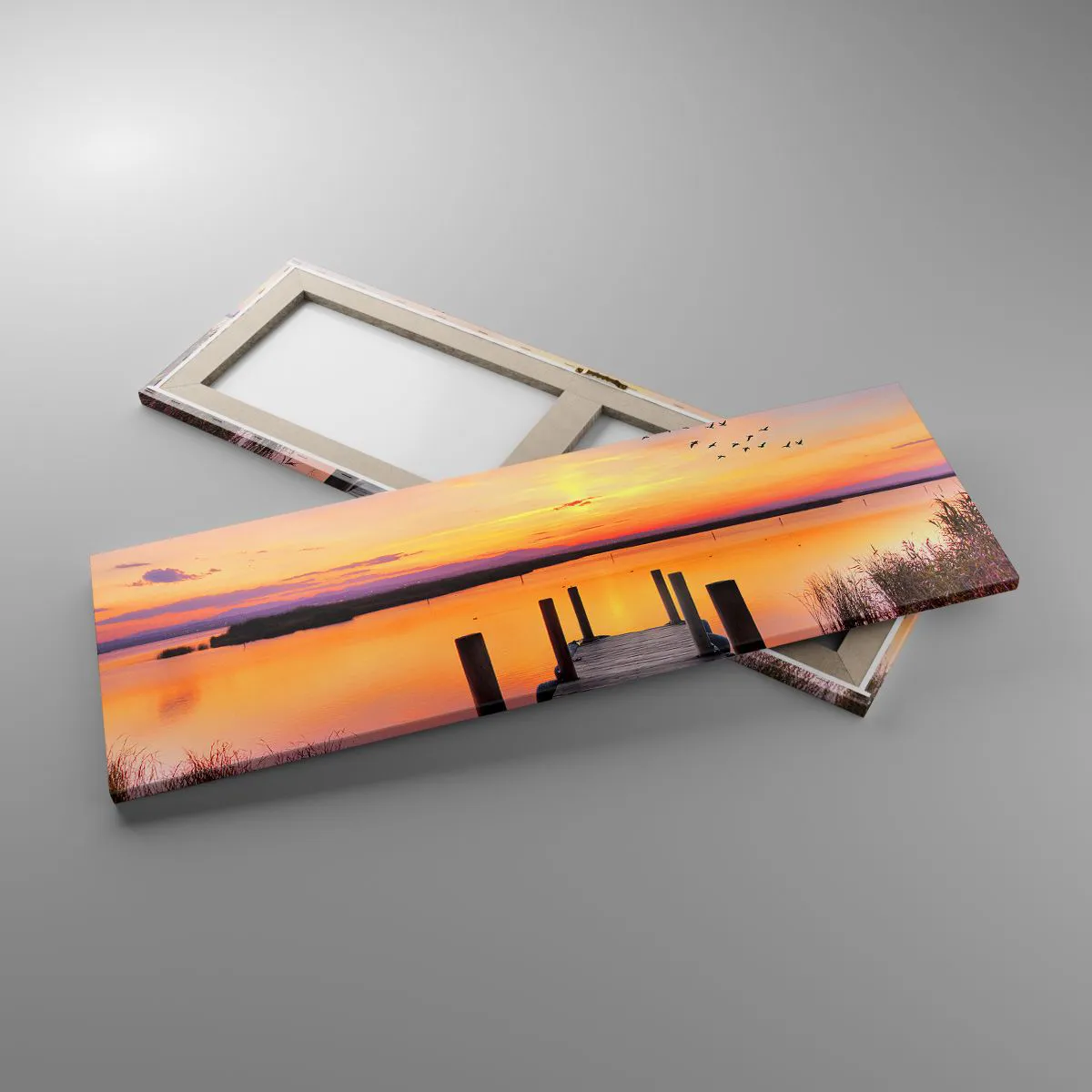 Die Leinwand wird über den Rahmen gespannt. Die Seiten und Kanten werden gedruckt, um das Bild fortzusetzen. Das Bild ist fertig zum Aufhängen an der Wand. Jedes Produkt hat einen am Rahmen befestigten Anhänger und ein Montageset (Schraube + Stift).