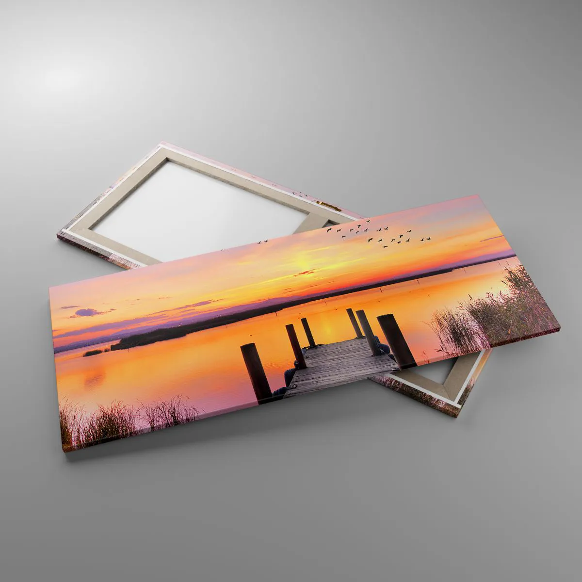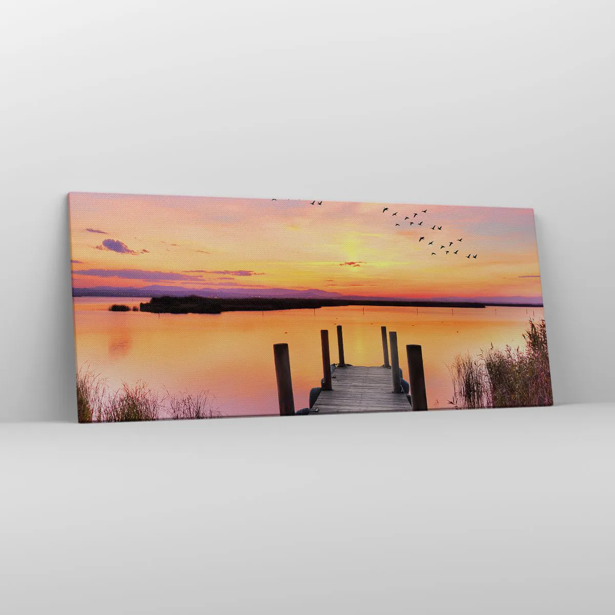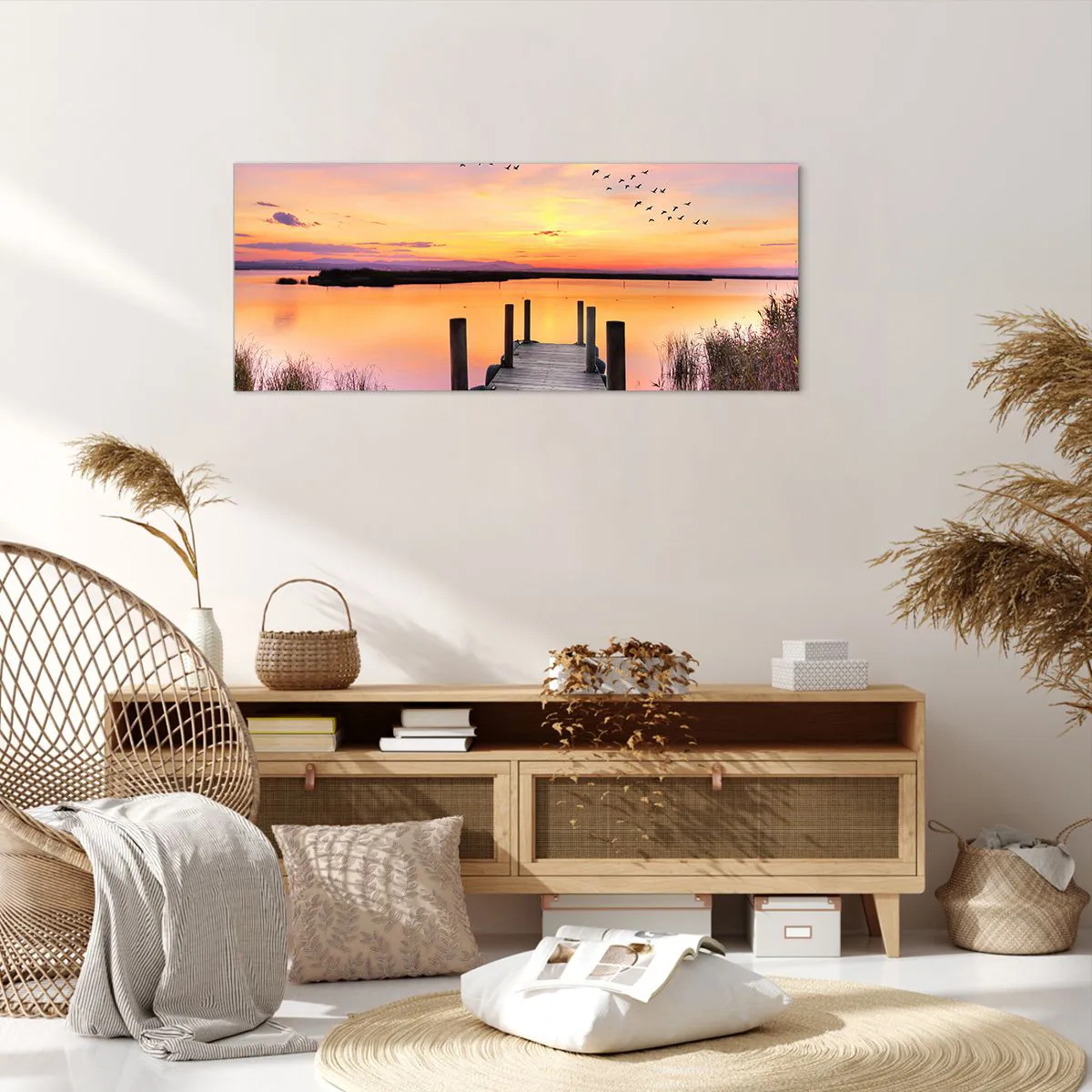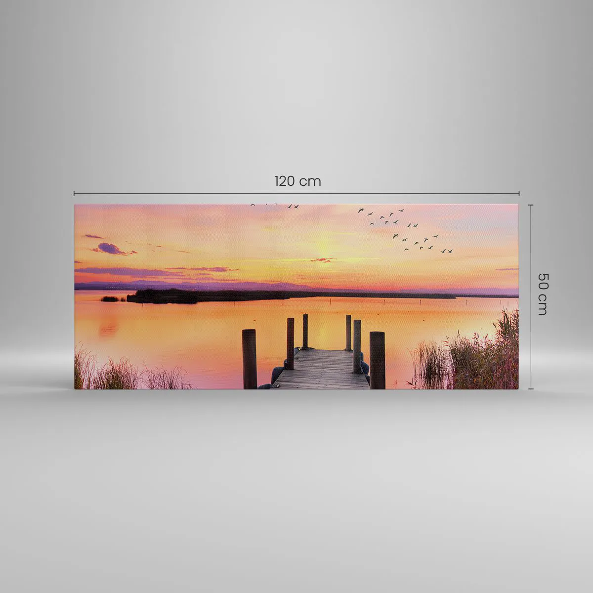 Bild auf Leinwand - Leinwandbild - Ein Pier an einem See bei Sonnenuntergang mit Vögeln am Himmel - 120x50cm - Violette stille Morgendämmerung - Moderne Wanddekoration für Wohnzimmer und Schlafzimmer ARTTOR
