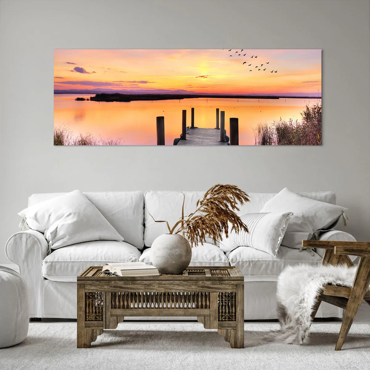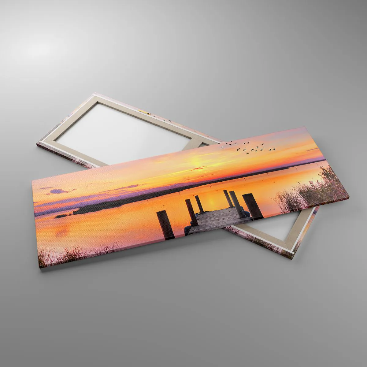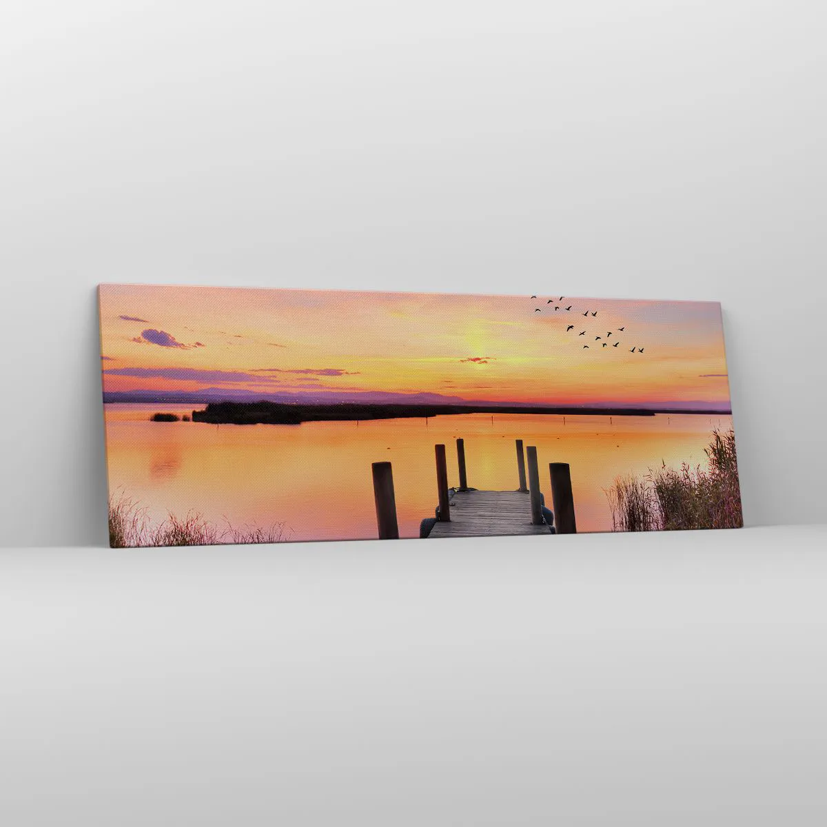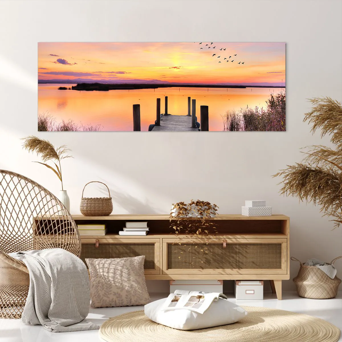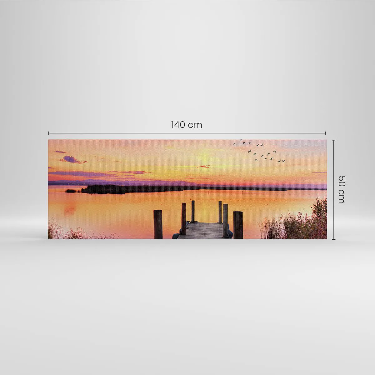 Bild auf Leinwand - Leinwandbild - Ein Pier an einem See bei Sonnenuntergang mit Vögeln am Himmel - 140x50cm - Violette stille Morgendämmerung - Moderne Wanddekoration für Wohnzimmer und Schlafzimmer ARTTOR