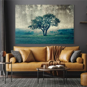 Glasbild - Bild auf glas - Ein einsamer Baum in einer Vintage-Landschaft - 120x80cm - Ein Apfelbaum auf blauem Feld? - Moderne Wanddekoration für Wohnzimmer und Schlafzimmer ARTTOR