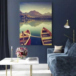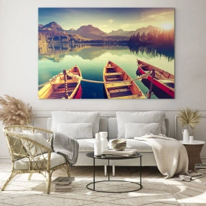 Glasbild - Bild auf glas - Boote auf einem ruhigen See, umgeben von Bergen bei Sonnenuntergang - 120x50cm - Lebe nach ihren Gesetzen - Moderne Wanddekoration für Wohnzimmer und Schlafzimmer ARTTOR