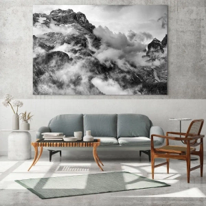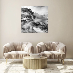 Glasbild - Bild auf glas - Schwarz-Weiß-Ansicht der von Wolken umgebenen Berge - 120x50cm - Schön und grausam - Moderne Wanddekoration für Wohnzimmer und Schlafzimmer ARTTOR