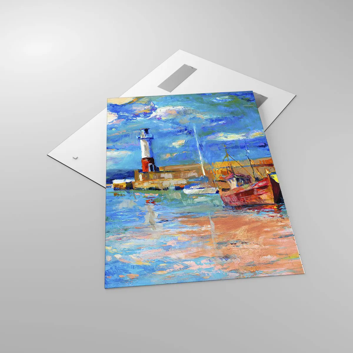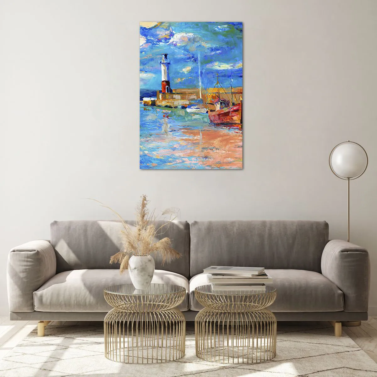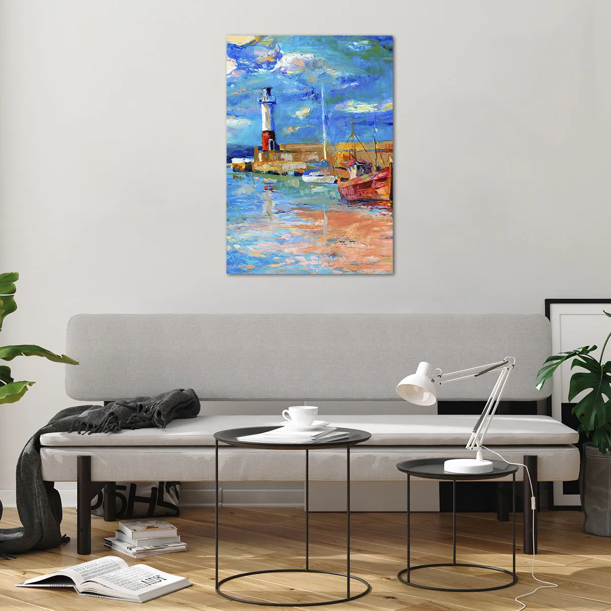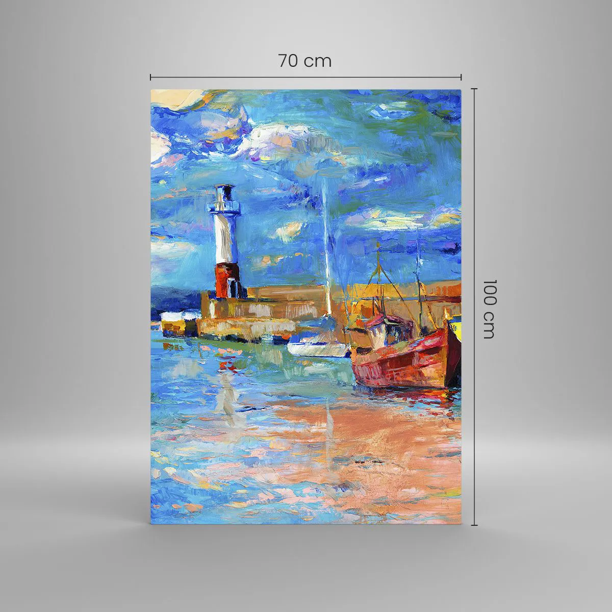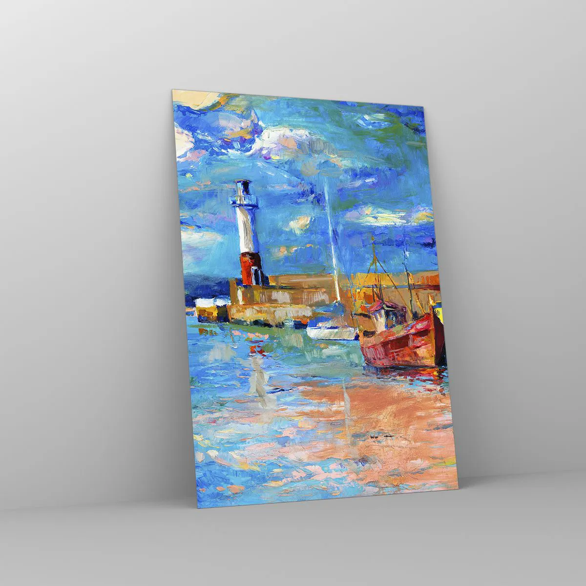 Glasbild - Bild auf glas - Fischerhafen mit Booten und einem Leuchtturm in leuchtenden Farben - 70x100cm - Ein Nachmittag in der Regenbogenbucht - Moderne Wanddekoration für Wohnzimmer und Schlafzimmer ARTTOR