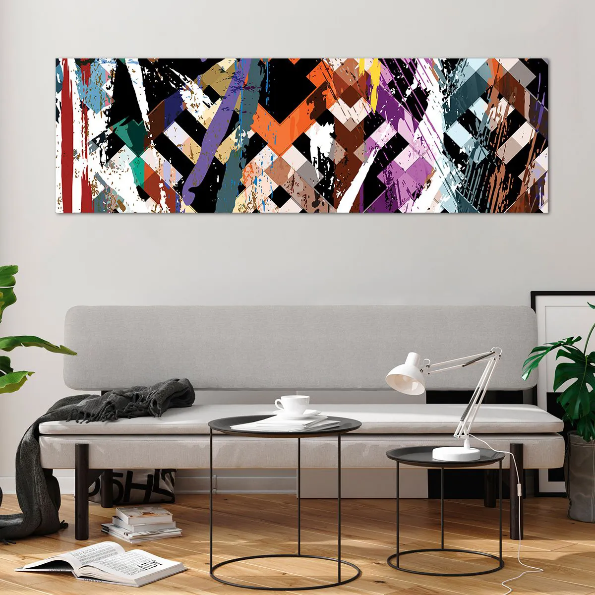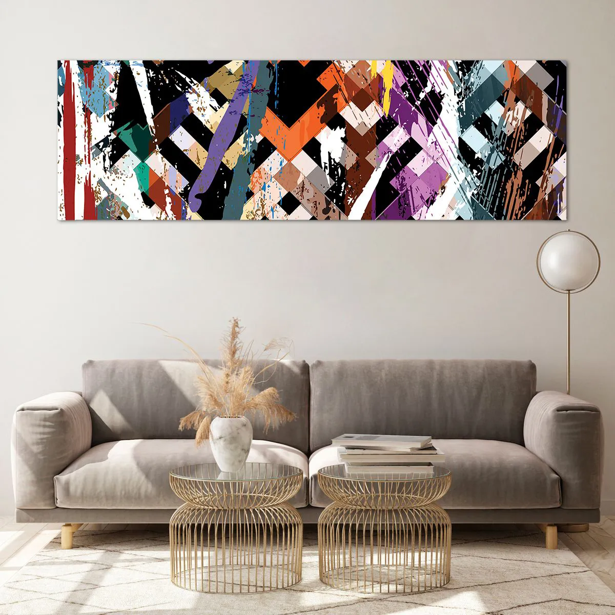 Glasbild - Bild auf glas - Abstrakte Komposition mit farbigen Linien auf schwarzem Hintergrund - 160x50cm - Quadriert - Moderne Wanddekoration für Wohnzimmer und Schlafzimmer ARTTOR