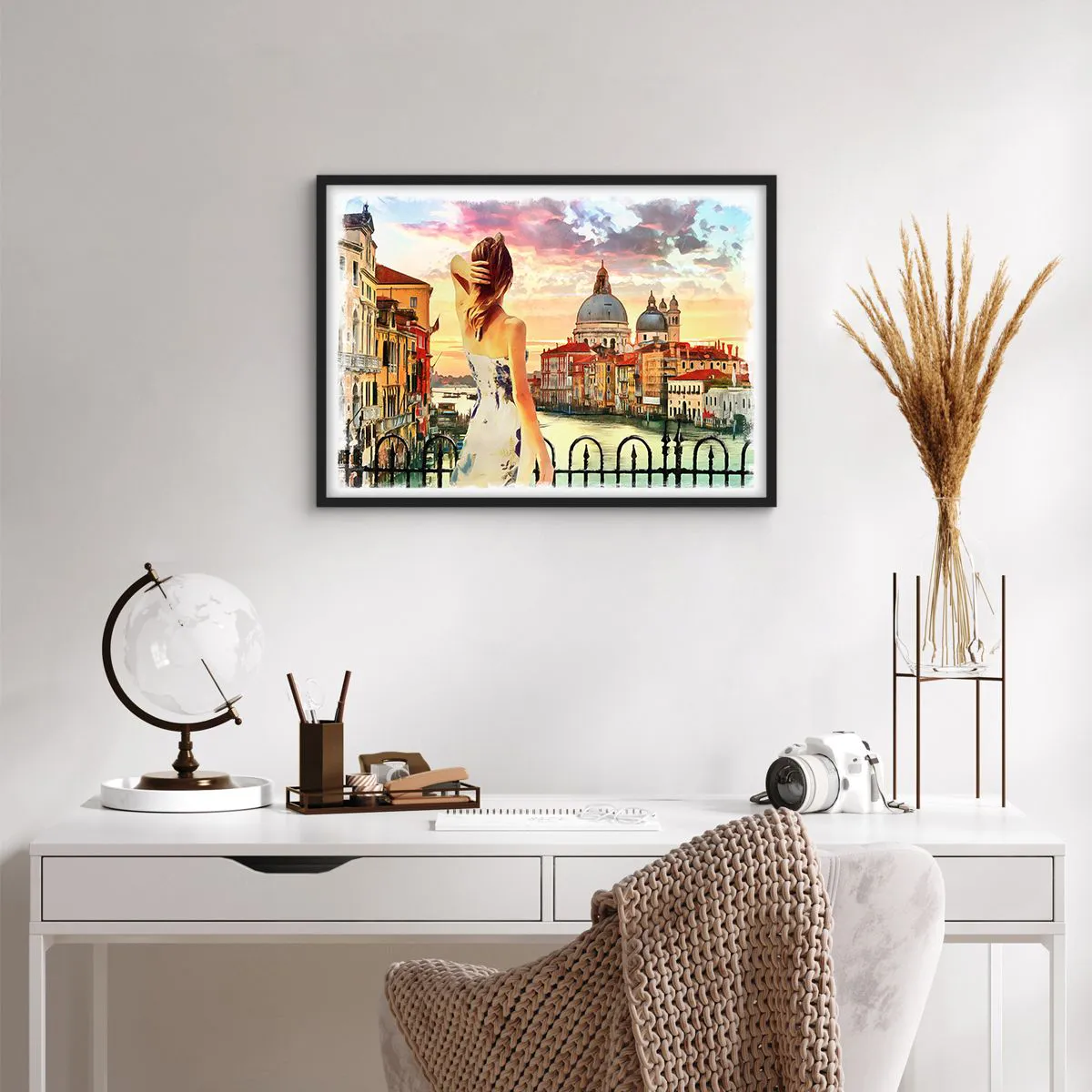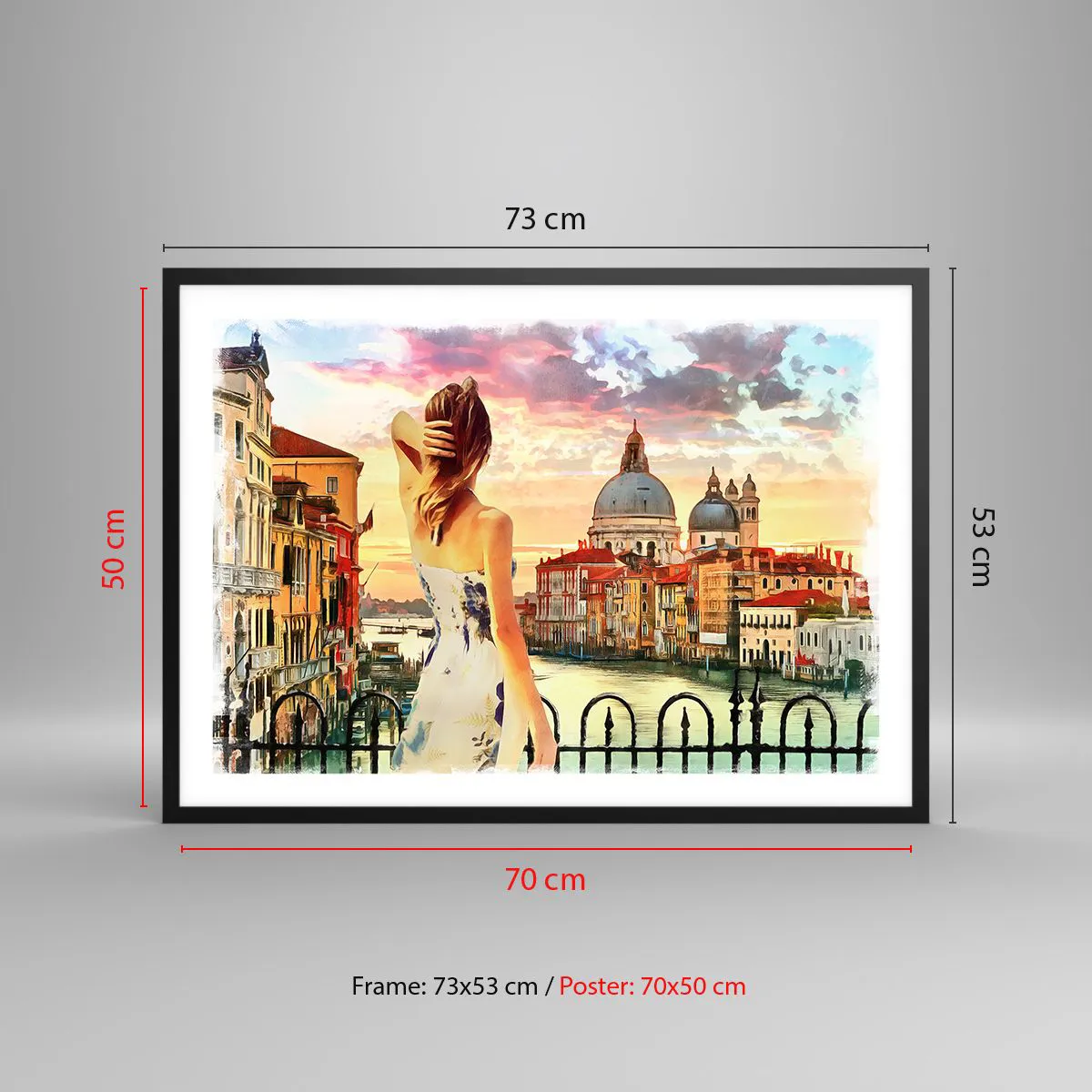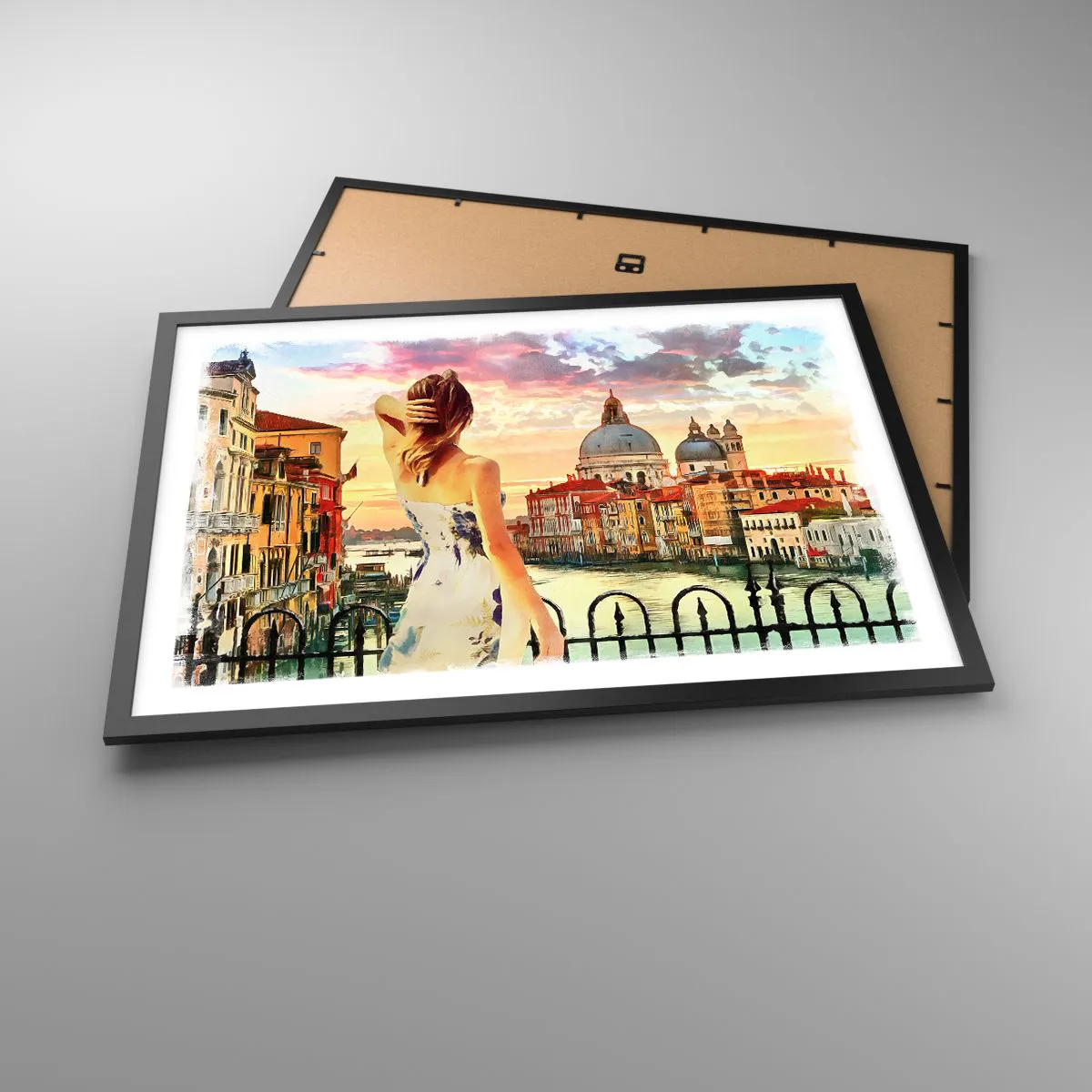 Poster in einem schwarzem Rahmen - Eine Frau bewundert die malerische Landschaft am Kanal - 70x50cm - Als Abenteuer nur in ... - Moderne Wanddekoration für Wohnzimmer und Schlafzimmer ARTTOR