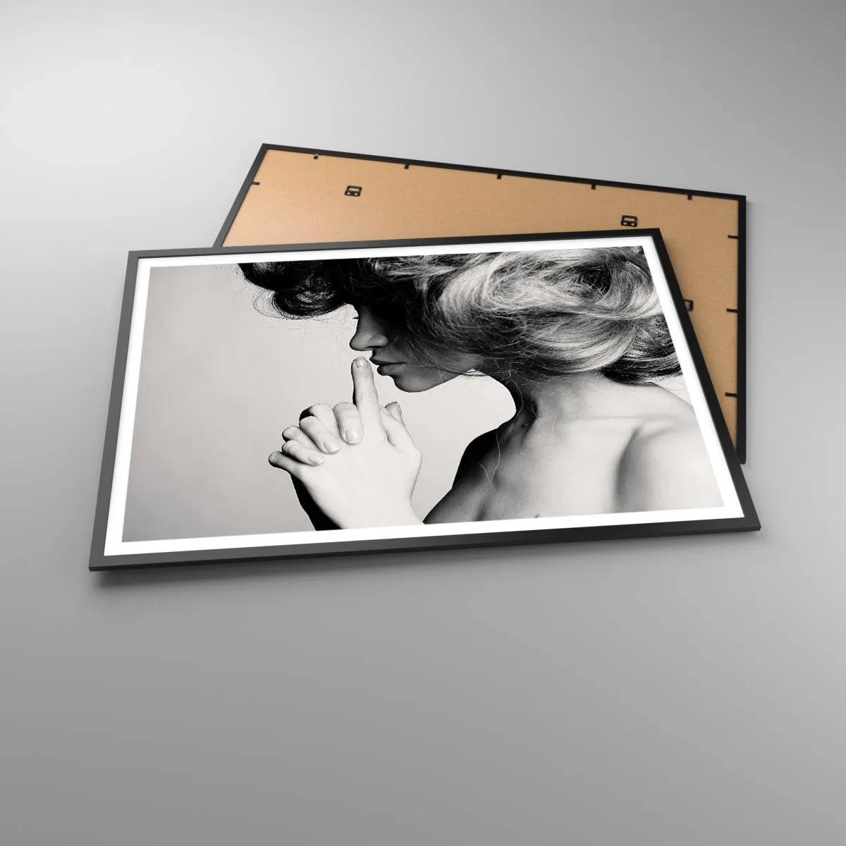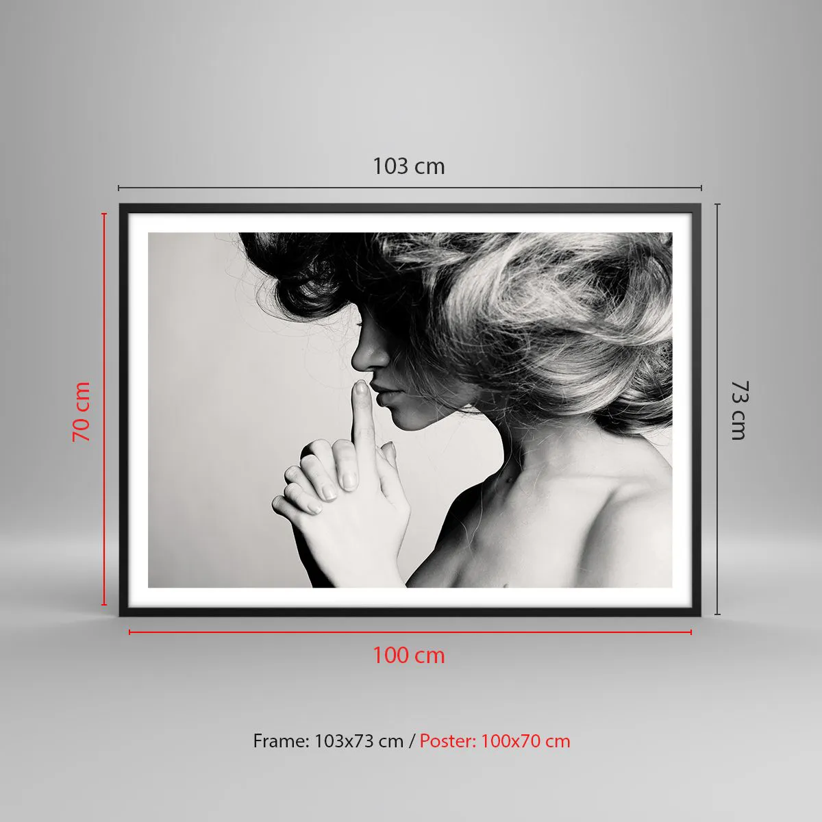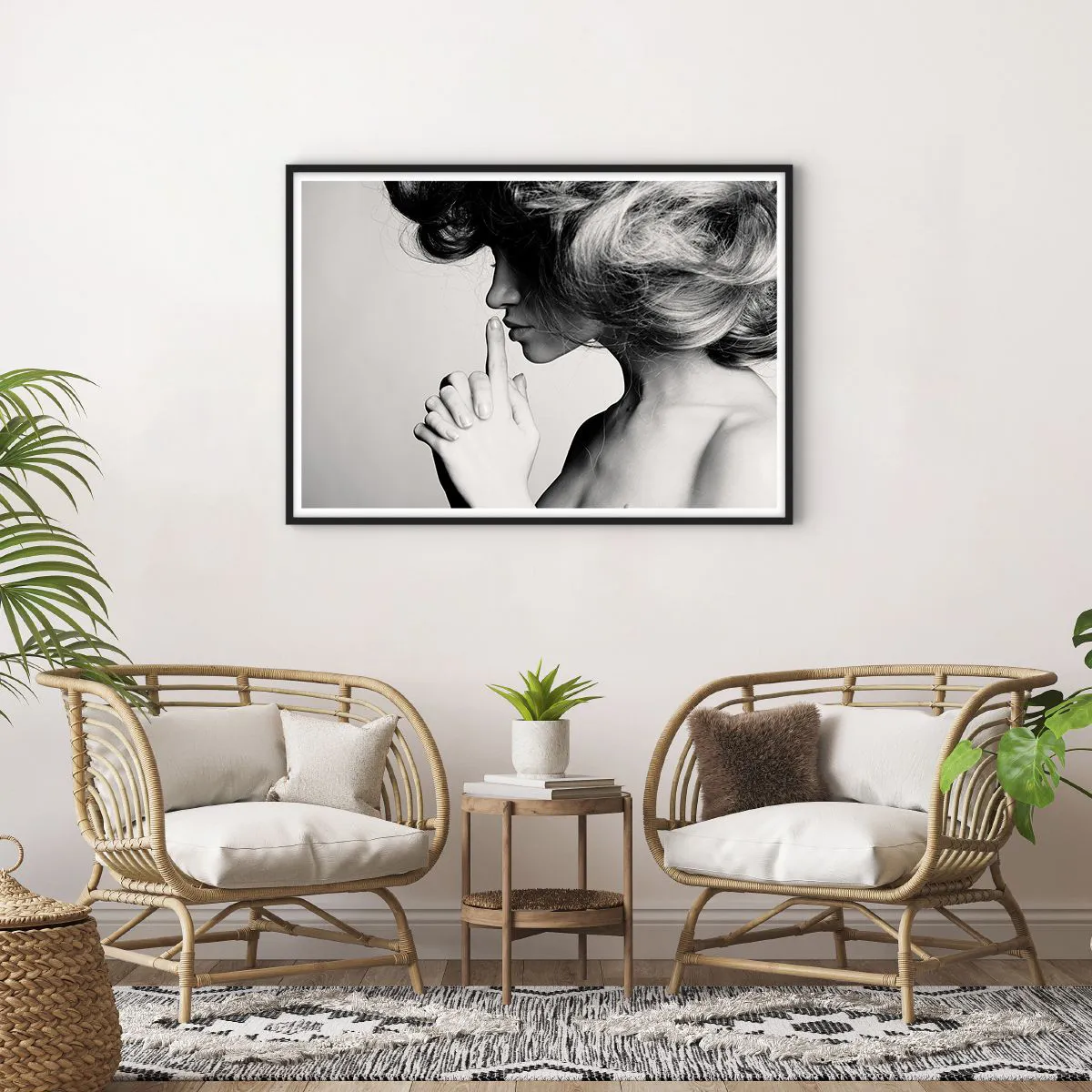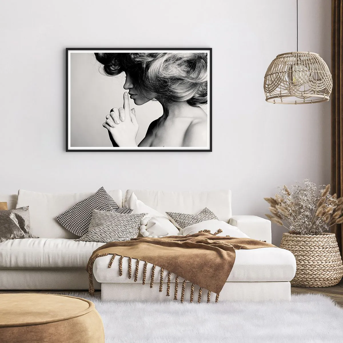 Poster in einem schwarzem Rahmen - Schwarz-weißes Profil einer Frau, die Stille gestikuliert - 100x70cm - Auf sich selbst hören - Moderne Wanddekoration für Wohnzimmer und Schlafzimmer ARTTOR