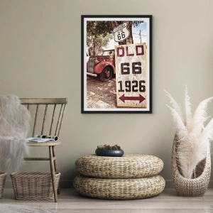 Poster in einem schwarzem Rahmen - Retro-Auto und Route 66-Schild in rustikalem Ambiente - 70x50cm - Die Legende der amerikanischen Provinz - Moderne Wanddekoration für Wohnzimmer und Schlafzimmer ARTTOR