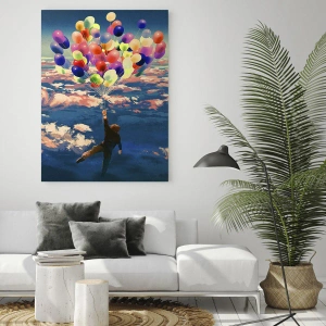 Wandbild - Kindheitstraum erfüllt – Eine Figur, die von bunten Luftballons in die Luft gehoben wird