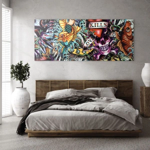 Glasbild - Bild auf glas - Farbenfrohe Kunstwerke im Tattoo-Stil mit Totenköpfen und nautischen Motiven - 140x50cm - Der Traum des Tätowierers - Moderne Wanddekoration für Wohnzimmer und Schlafzimmer ARTTOR
