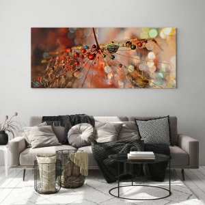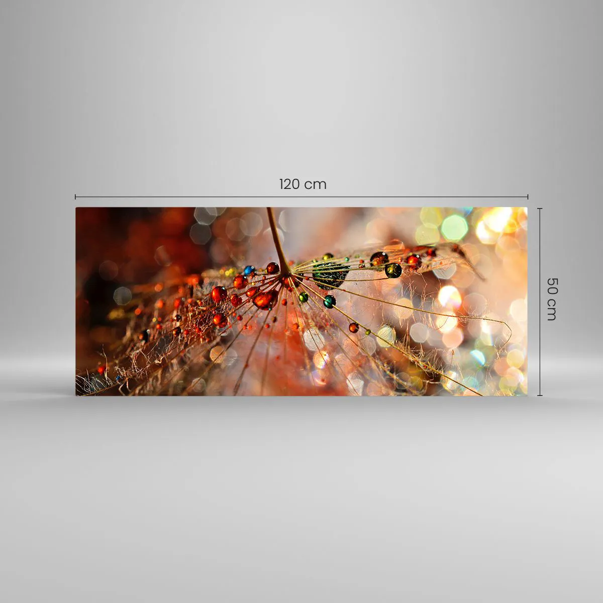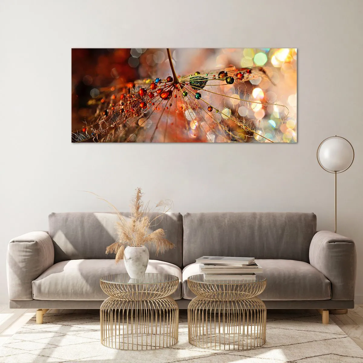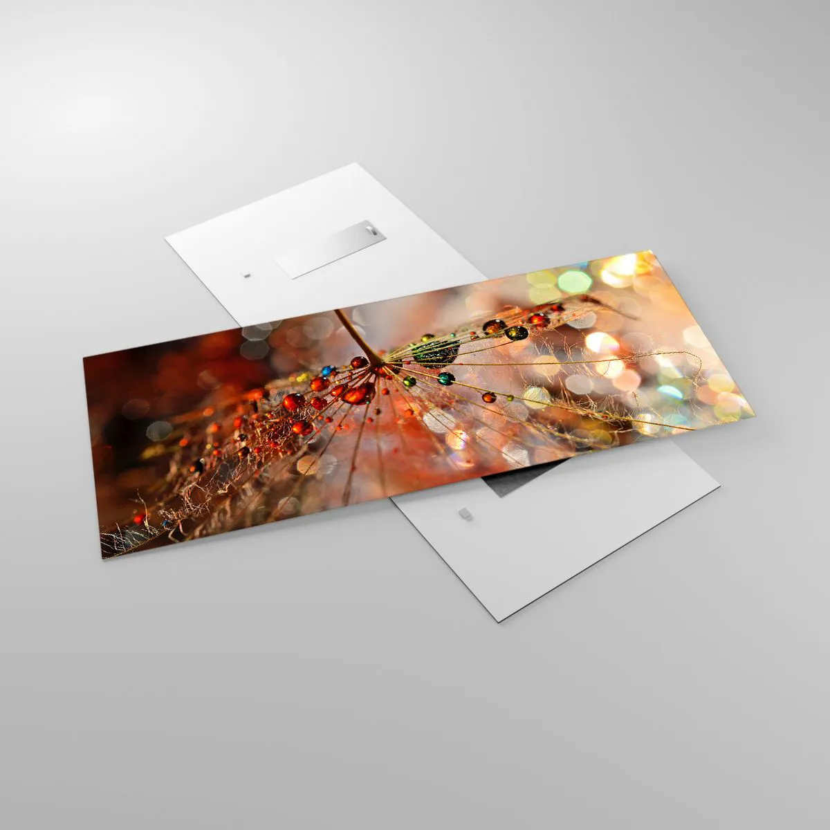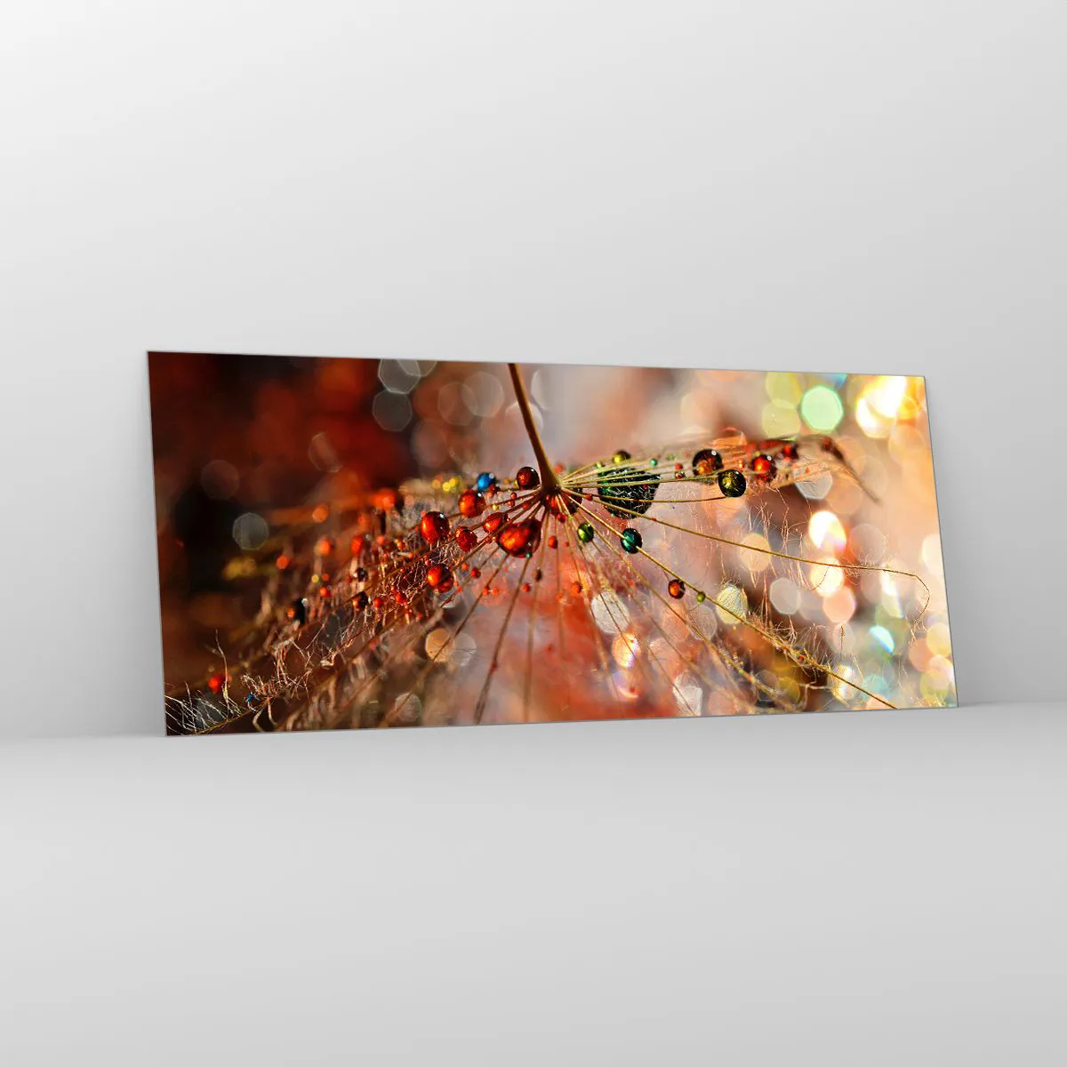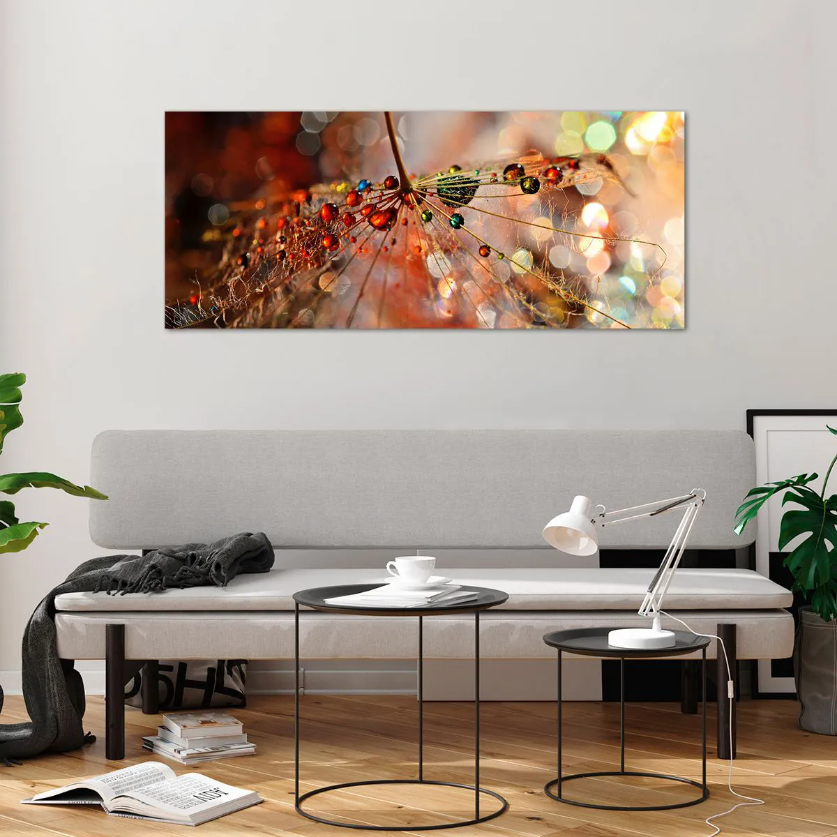 Glasbild - Bild auf glas - Makrofotografie eines Wassertropfens auf einer zarten Pflanze - 120x50cm - Auf einem Spinnenfaden aufgefädelt - Moderne Wanddekoration für Wohnzimmer und Schlafzimmer ARTTOR