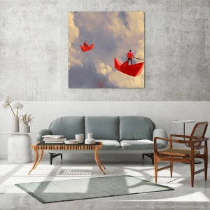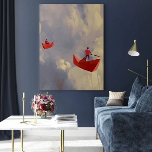Glasbild - Bild auf glas - Zwei Menschen in roten Booten vor einem bewölkten Himmel - 100x70cm - Expedition der Träumer - Moderne Wanddekoration für Wohnzimmer und Schlafzimmer ARTTOR