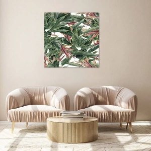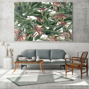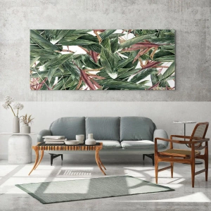 Glasbild - Bild auf glas - Blätter in Grün- und Burgundertönen auf hellem Hintergrund - 120x80cm - Smaragd-lila Dickicht - Moderne Wanddekoration für Wohnzimmer und Schlafzimmer ARTTOR