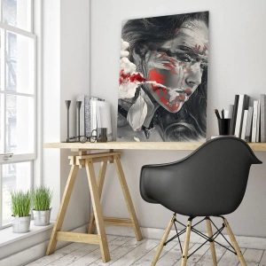 Glasbild - Bild auf glas - Künstlerisches Frauenportrait mit abstrakten roten Akzenten - 160x50cm - Im Dunst der Absurdität - Moderne Wanddekoration für Wohnzimmer und Schlafzimmer ARTTOR