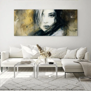 Glasbild - Bild auf glas - Porträt einer Frau vor einem Hintergrund aus abstrakten Flecken in Beigetönen - 70x100cm - unschuldiger oder sinnlicher? - Moderne Wanddekoration für Wohnzimmer und Schlafzimmer ARTTOR