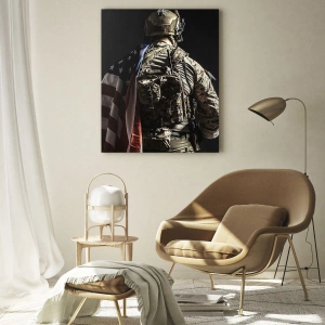 Glasbild - Bild auf glas - Ein Soldat in Uniform mit einer Flagge vor dunklem Hintergrund - 120x50cm - Darum - Moderne Wanddekoration für Wohnzimmer und Schlafzimmer ARTTOR