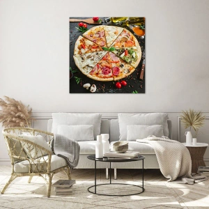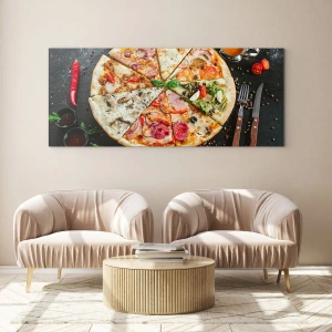 Glasbild - Bild auf glas - Pizza in verschiedenen Geschmacksrichtungen mit verschiedenen Belägen - 160x50cm - Eine Reihe von Geschmacksrichtungen - Moderne Wanddekoration für Wohnzimmer und Schlafzimmer ARTTOR