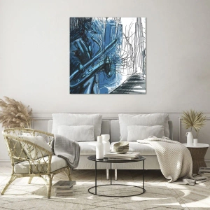 Glasbild - Bild auf glas - Jazz-Saxophonist in blau getönter urbaner Umgebung - 120x80cm - Urbane Rhapsodie - Moderne Wanddekoration für Wohnzimmer und Schlafzimmer ARTTOR