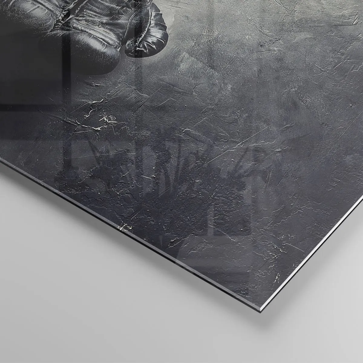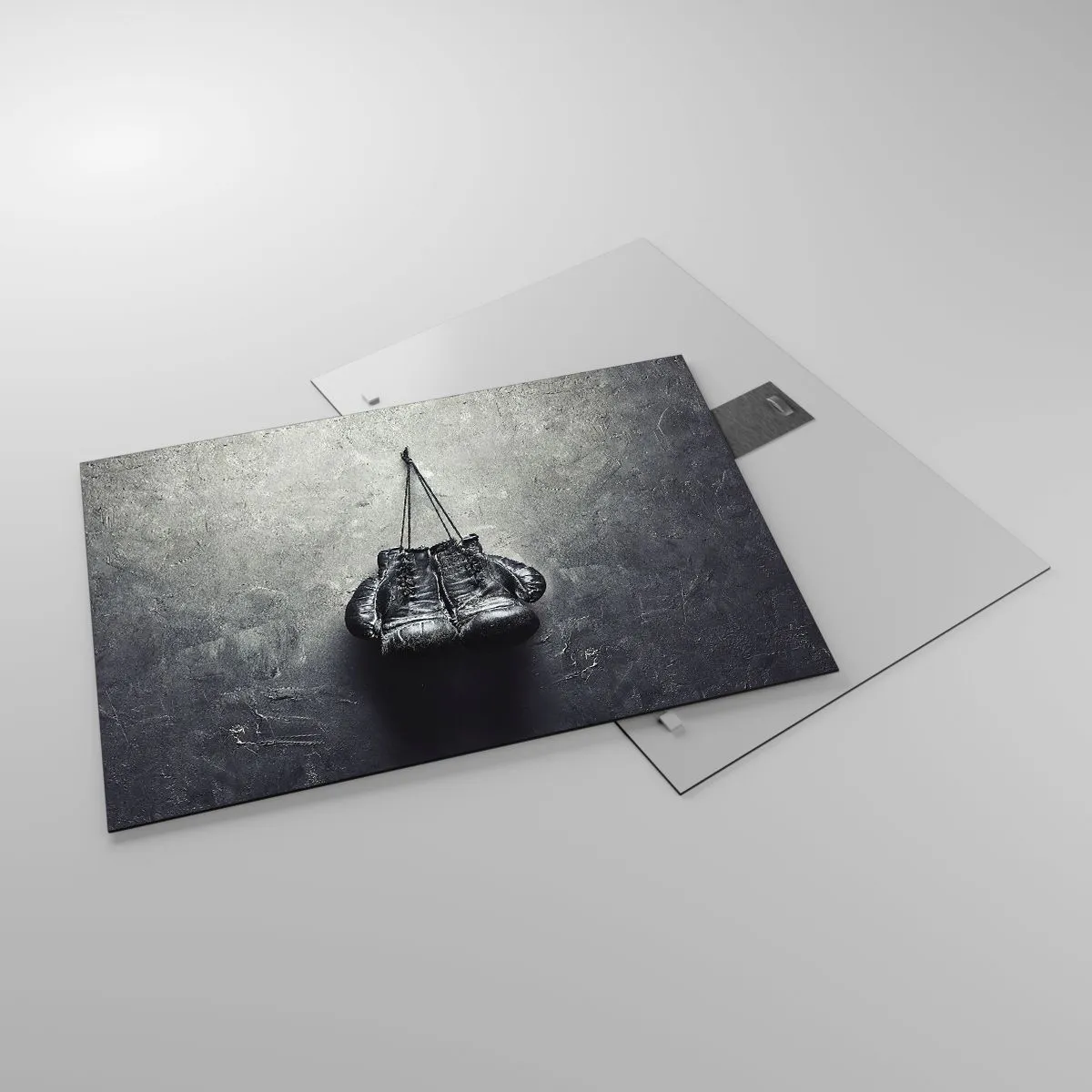 „Kampfzeit und friedliche Zeit“ ist ein einzigartiger Glaskunstdruck im Format 70 x 50 cm, der schwarze Boxhandschuhe zeigt, die an einer grauen, strukturierten Wand hängen. Das minimalistische Design und der Kontrast zwischen dem intensiven Schwarz der Handschuhe und dem gedämpften Hintergrund betonen die Ausdruckskraft und Stärke dieser Komposition.